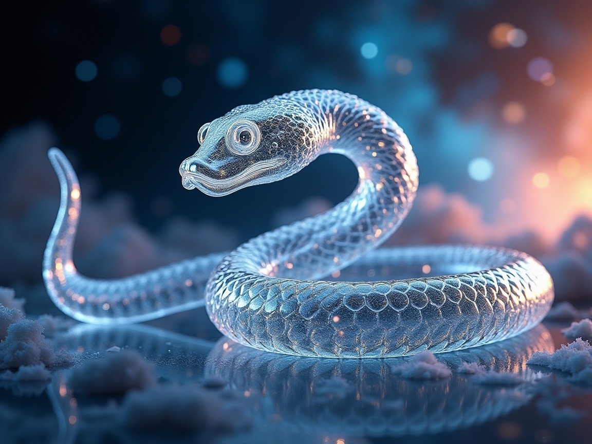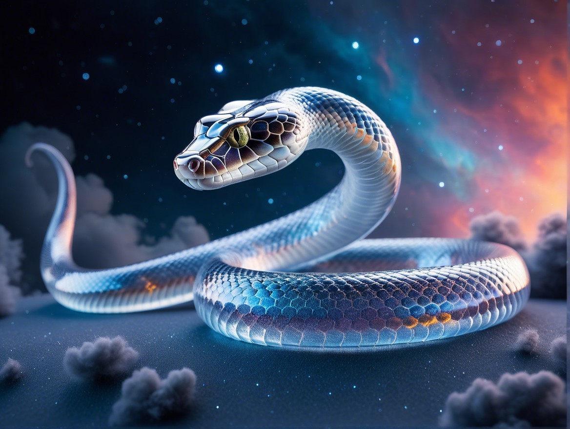 A mesmerizing snake with iridescent scales coils against a cosmic backdrop of vibrant galaxies and stars, showcasing a blend of colors and a surreal, otherworldly atmosphere.