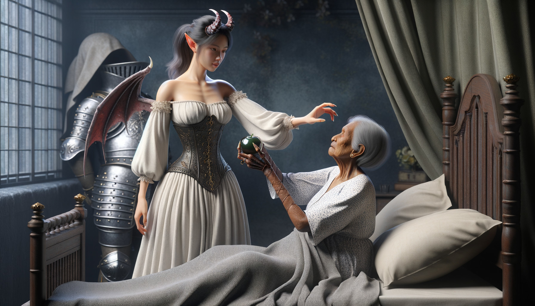 Prompt: Photo-realistic, Insanely Detailed Young Demon female aged in her 20s standing over nursing an elderly human woman lying down in bed, Demon woman wearing simple commoner gown with bustier and corset. old human woman wearing nightgown, gazing beyond camera lens, interwoven with demon appendages, small horns, claws, slender, hourglass physique, broad hips, partly human, Standing Up, full length view, dynamic movement reaching for the ball. Background scene of commoner bedroom in fantasy world, in corner of room an old suit of plate armour. Realistic Detailed Body, Realistic Face, High Quality Resolution, Ultra-Sharp Focus, Bright natural Lighting, in 64K Resolution, HDR+