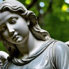 The image features a serene angel statue with flowing hair and wings. The soft expression and detailed features are complemented by a lush green background, creating a tranquil atmosphere.