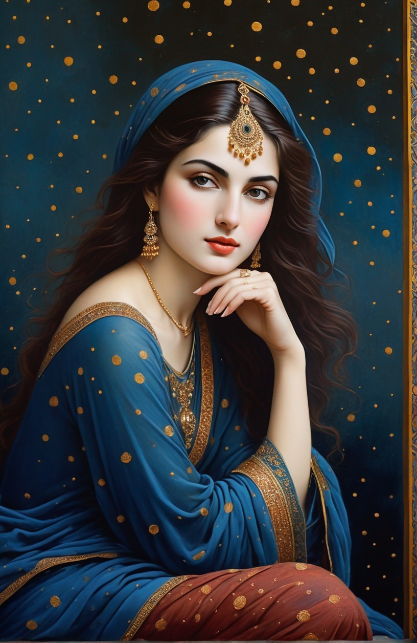 fashionable young enchantress, magic realism, misty morning. 3rd century Persian miniature art . dark sky-blue and dark gold, energy-filled illustrations, delicate pointillism, bold stencil, celestial, screen printing, organic (Padmanabha