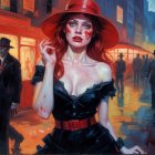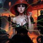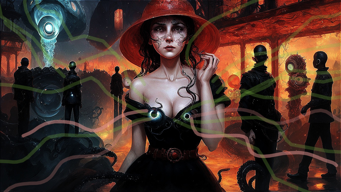 A surreal scene features a mysterious woman in an elegant black dress and hat, surrounded by enigmatic figures, swirling tentacles, and cosmic elements, blending intrigue and otherworldly themes.