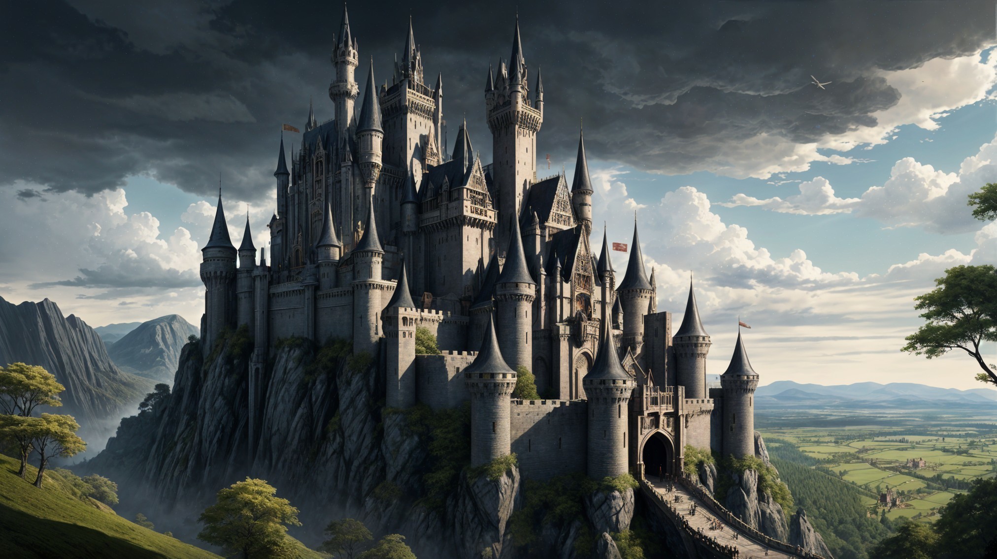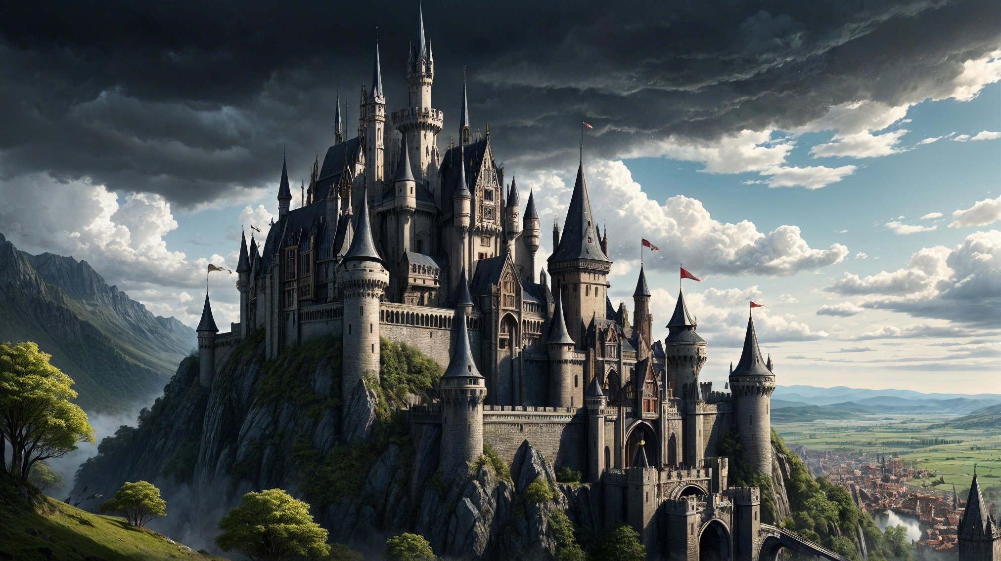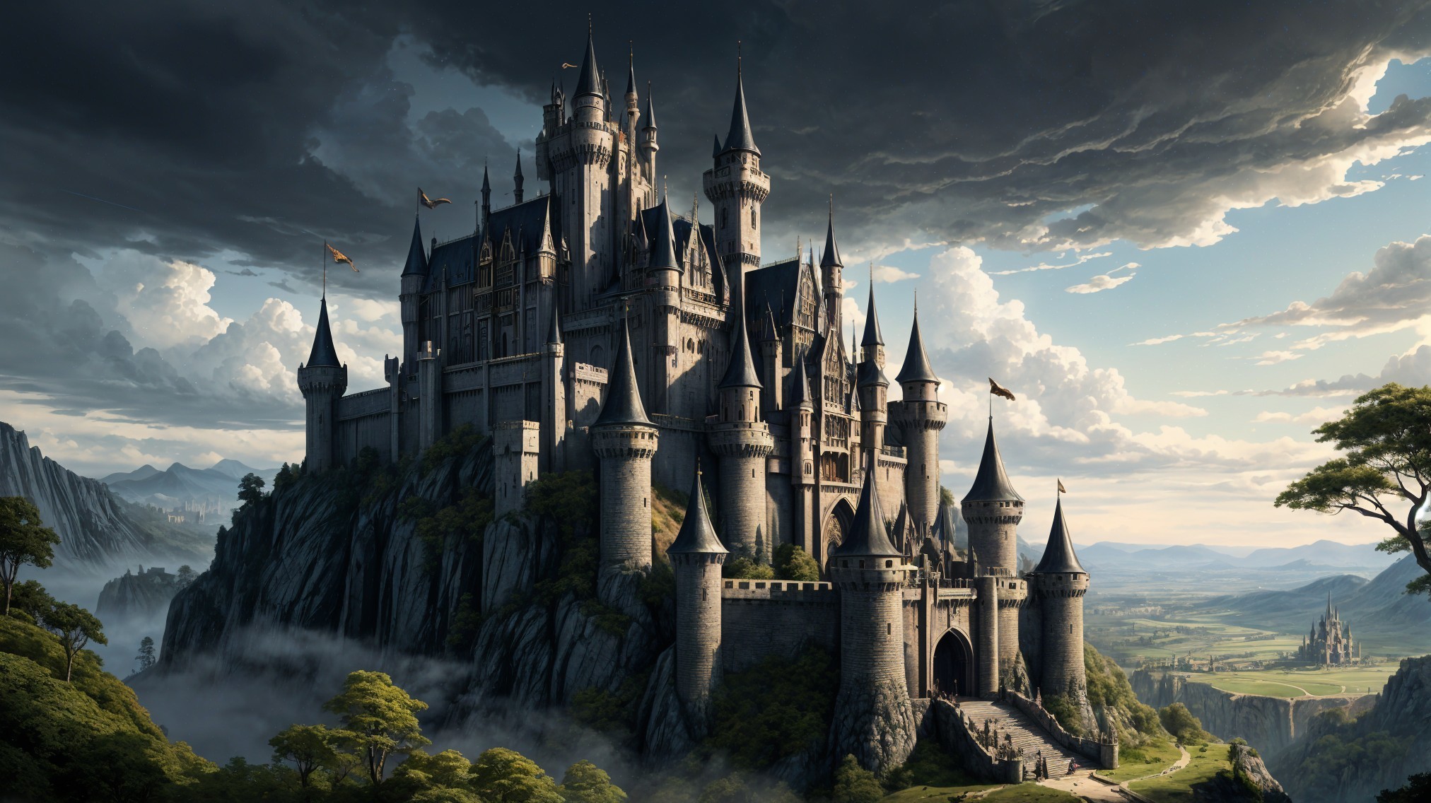 A grand, fairy-tale castle perched atop a rocky hill, adorned with tall spires and intricate architecture. Dark clouds loom above, contrasting with the lush landscape and distant mountains.