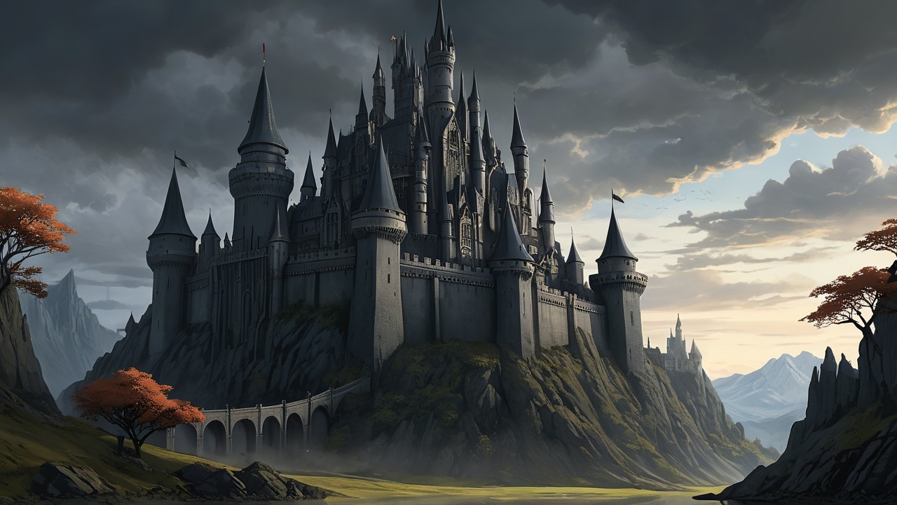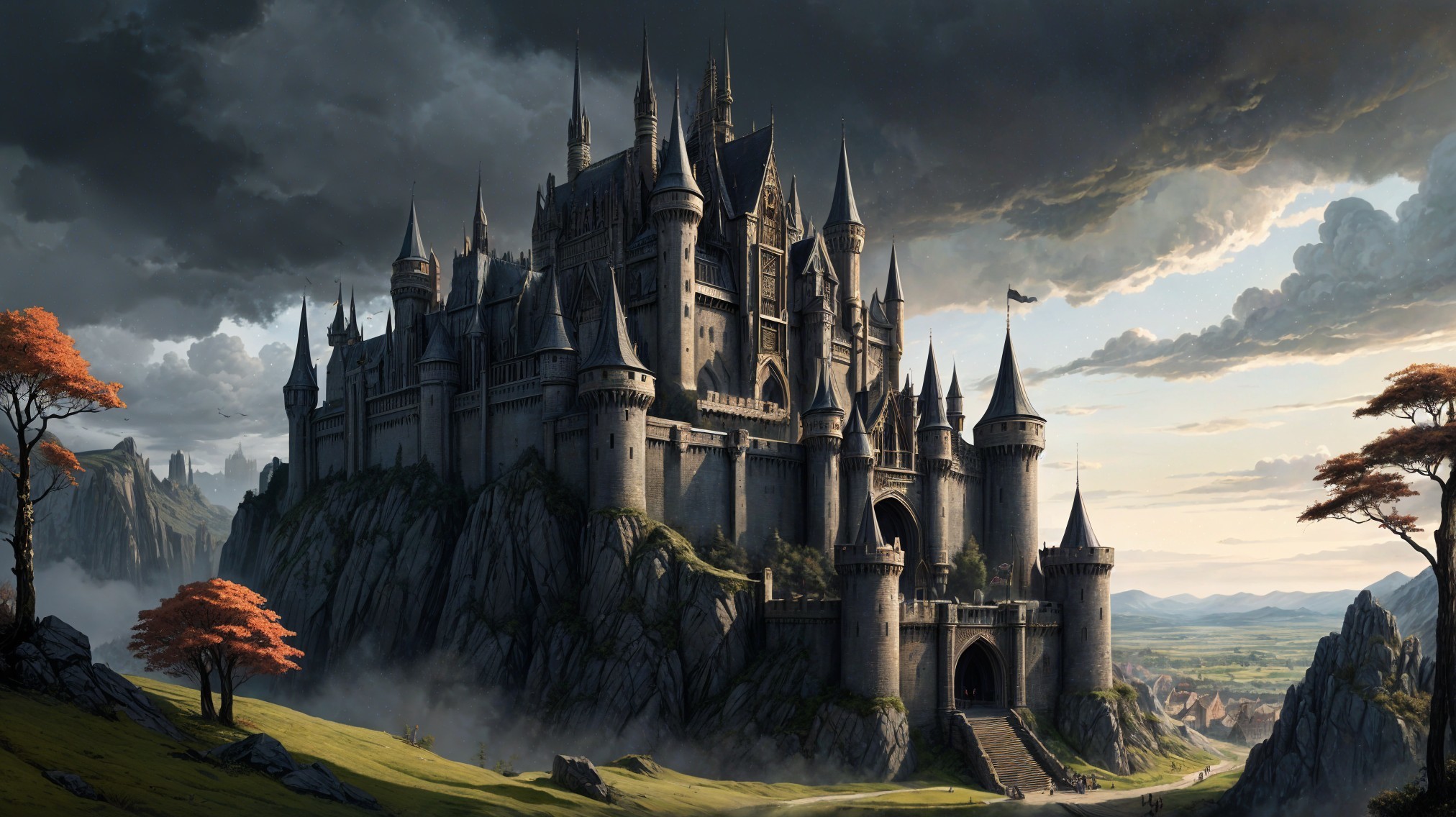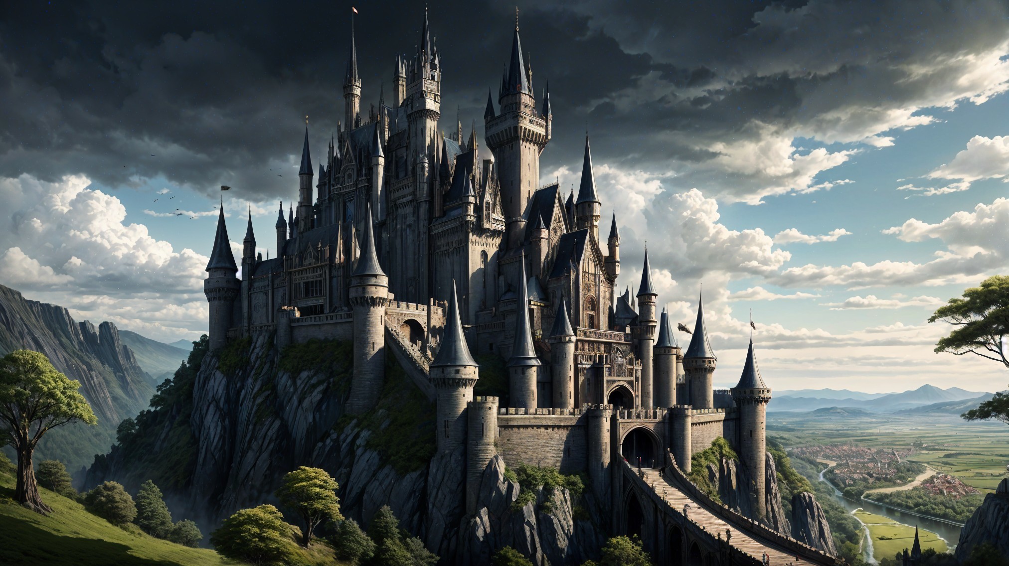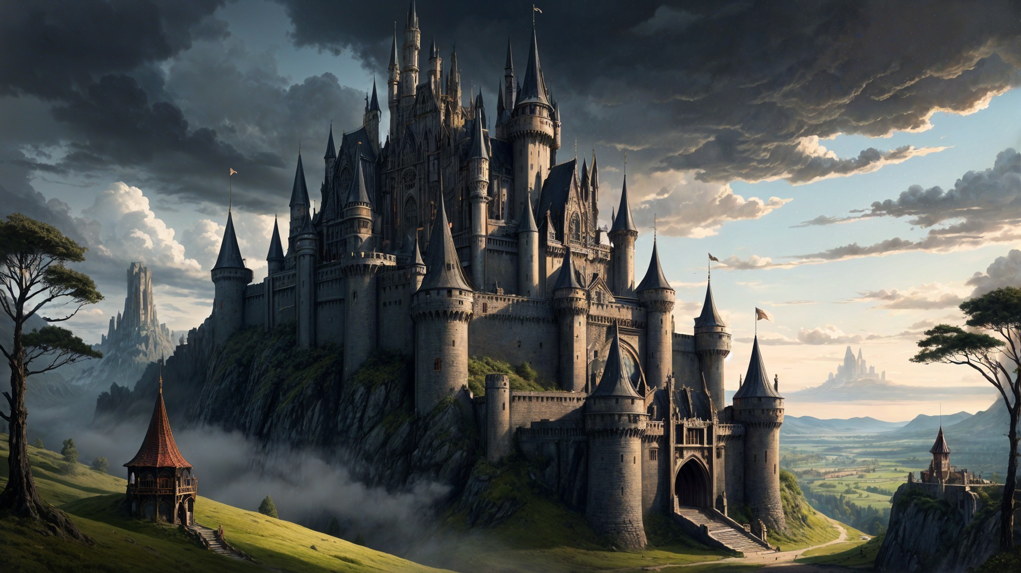 A grand, fairy-tale castle perched atop a rocky hill, adorned with tall spires and intricate architecture. Dark clouds loom above, contrasting with the lush landscape and distant mountains.