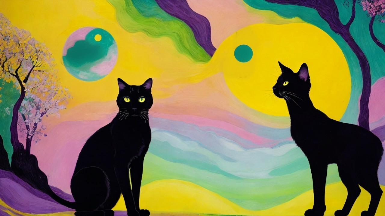 A vibrant, surreal scene featuring two black cats silhouetted against a swirling backdrop of colorful clouds and celestial bodies, with bold yellows, purples, and greens capturing a dreamlike atmosphere.