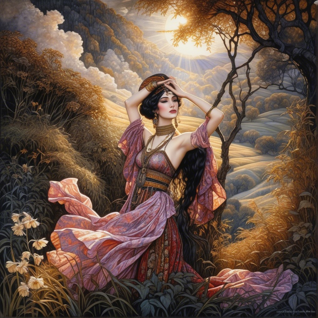 Two elegant women are depicted in a serene landscape at sunset. One stands gracefully, while the other sits below, surrounded by golden fields and softly illuminated by the moonlight.