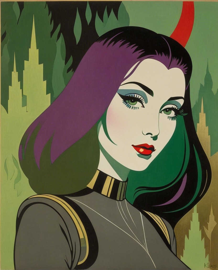 Prompt: Enchanting Woodblock Print: Hard Rock Rockette in a mesmerizing woodblock print by Earl Moran. Stylized tesselated hairstyle, triadic color scheme lilac, Sea-green, black by Georgia O'Keeffe, portrait features intricate, balanced coloring, stylized details against a natural forest backdrop reminiscent of American Gothic merged with comic book art. The artwork showcases dynamic lighting and ambient occlusion for depth, while parallax occlusion enhances the three-dimensional effect. Embrace a fusion of styles with elements of foampunk, detailed line art, and a splash ink technique reminiscent of Paul Kidby. The color palette is a vivid mix of pastel tones, with metallic sparkling effects and warm coloring to create a whimsical and psychedelic ambiance. Dive into the world of traumacore with hatching details and a soft, ethereal atmosphere. The piece exudes sensuality and depth, drawing inspiration from VFX techniques and luminous storytelling akin to Arlie Opal., high-quality digital painting with a focus on fantasy elements and precise execution. The art style blends elements influenced by Stan Lee and Ho Baron, with a triadic color scheme of beige, brown, and ochre. Explore the intricate patterns and textures, from stippled effects to visible textures, creating a coherent lineage with a touch of whimsy, wispy filaments on the skirt to the metallic accents. The lighting effects, including bokeh, are stylized by Josephine Wall, alcohol ink merged with watercolour and pen, fantasycore, whimsical, hyper-realistic, markers and ink painting, sharp focus, dark fantasy art, adventurous, Ghibli influence, acidic wash, rim lighting. Japanese anime referred, tints of 1970s comic book art, brightness 1.4,