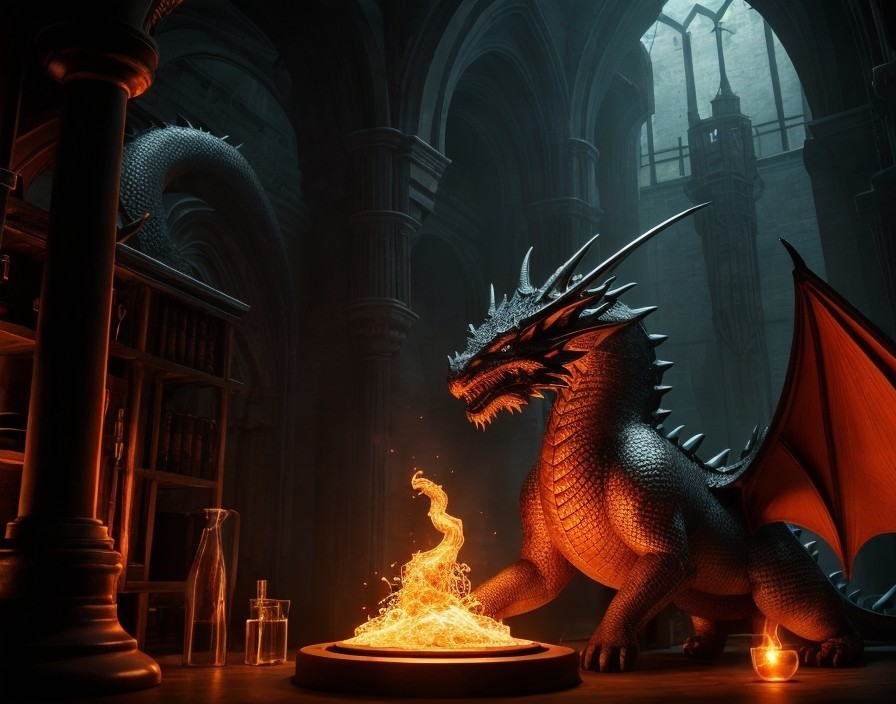 Ancient Chamber with Black Dragon and Cauldron Flames