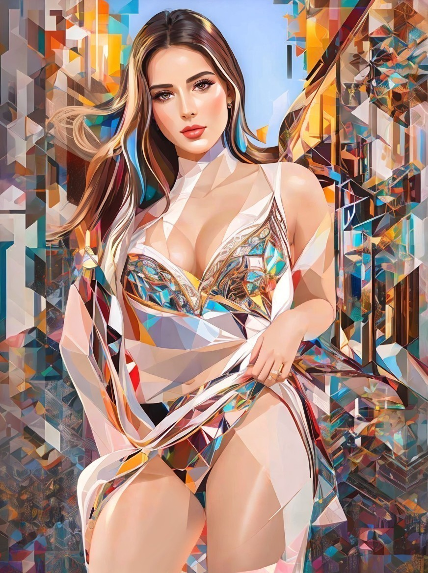 The image features a stylized, colorful portrait of a woman draped in elegant, shimmering fabric. The artwork employs geometric shapes and vibrant hues, creating a dynamic, modern aesthetic.