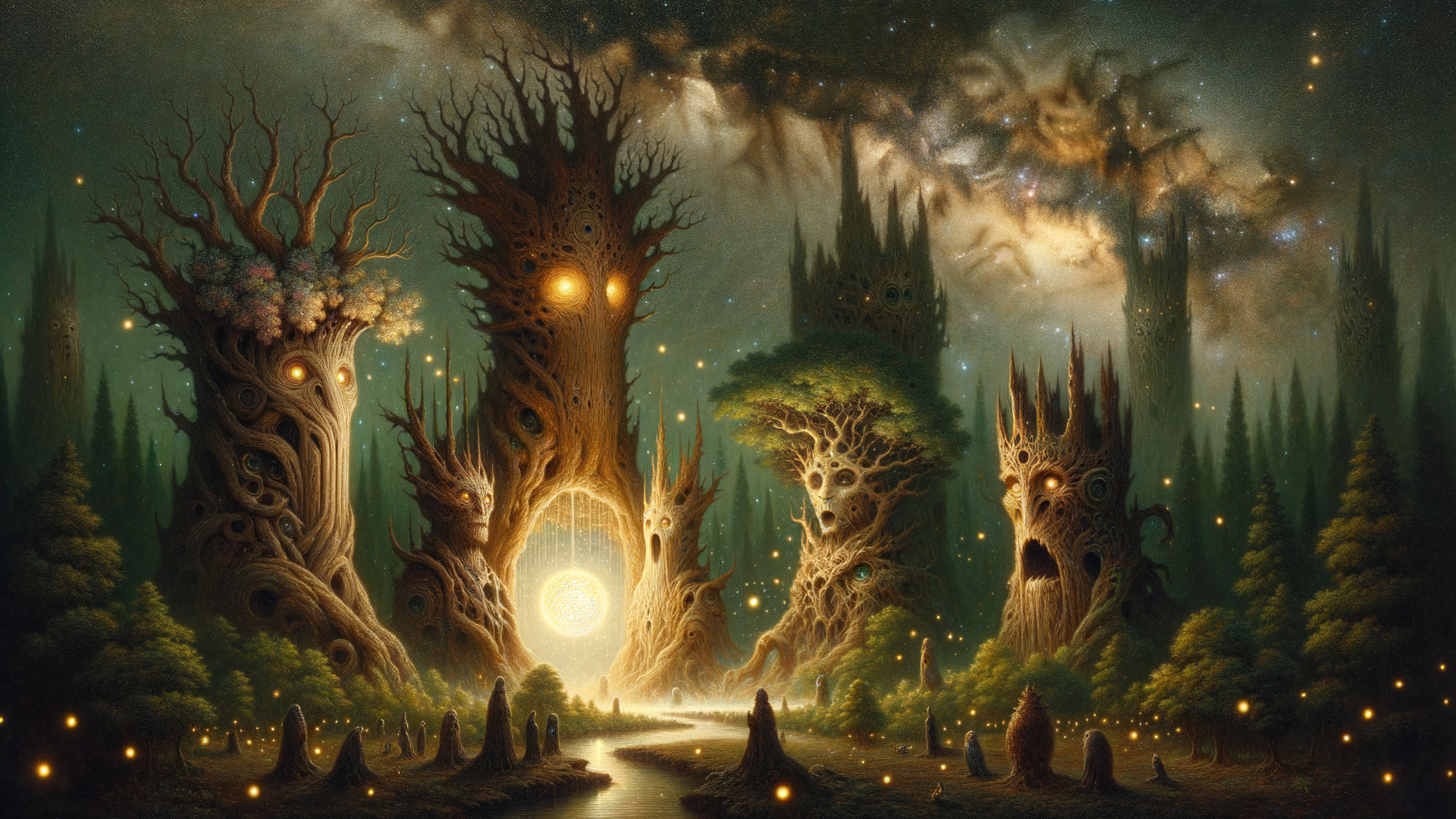 A surreal landscape features towering, luminous trees intertwined with golden orbs. A giant moon looms above, casting a mystical glow over winding paths and a serene water body.