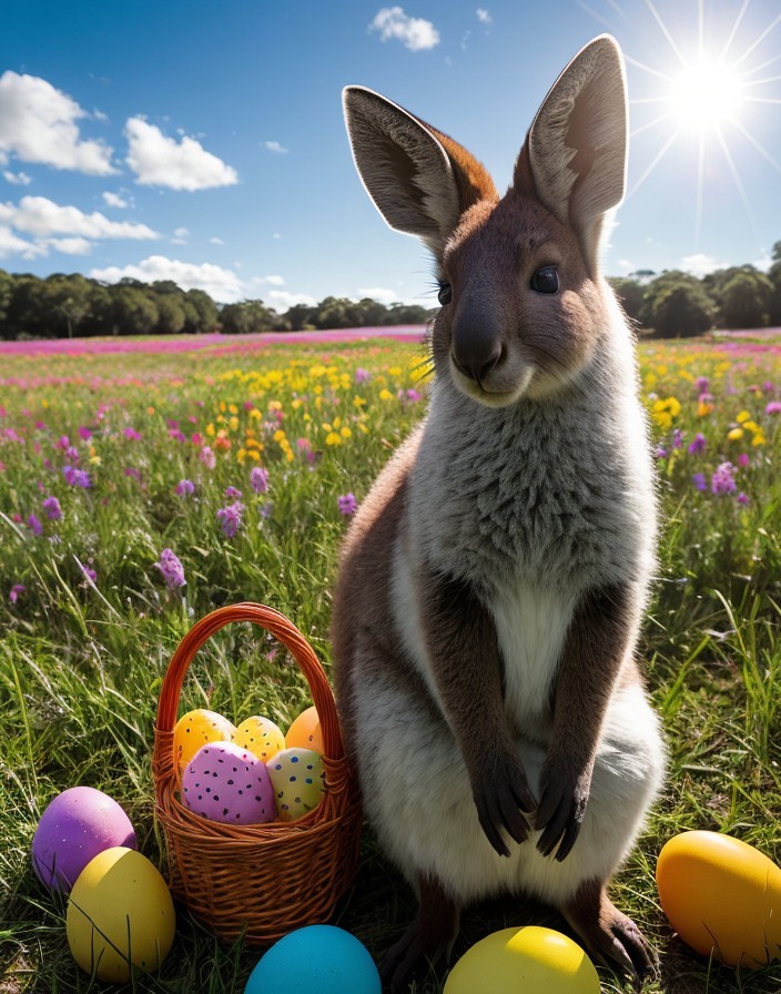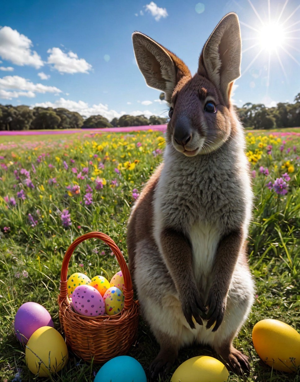 Prompt: "151515·Photograph capturing a playful moment a fluffy Wallaby in the meadow with a basket of colorful Easter eggs, against a backdrop of blooming flowers, lens flare effects reminiscent of Annie Leibovitz's style, vibrant colors, hyperrealistic details, 8k resolution.[blending Junji Ito's horror with Robert Oxley's mastery, Gazelli's uncanny touch, and M.W. Kaluta's surrealism. Featuring mixed brush strokes, paint splatter, and drip painting, creating a masterpiece in 8k resolution, trending on ArtStation]{The high-resolution, photorealistic quality captured with a Nikon Z9 and 85mm F1.2 lens enhances the intricate details and hues of the composition}"
