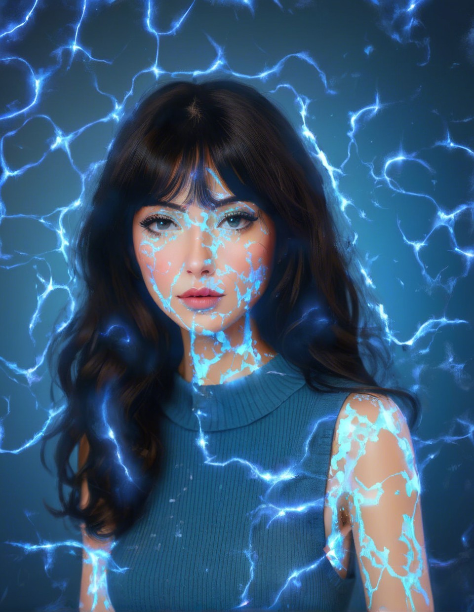 A mesmerizing digital artwork of a young woman with striking features. Her skin is illuminated with electric blue lightning patterns, set against a deep blue background, creating a surreal vibe.