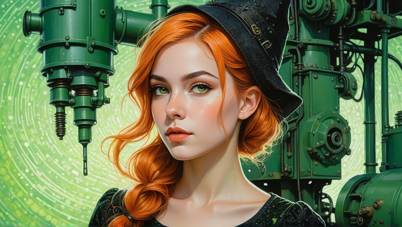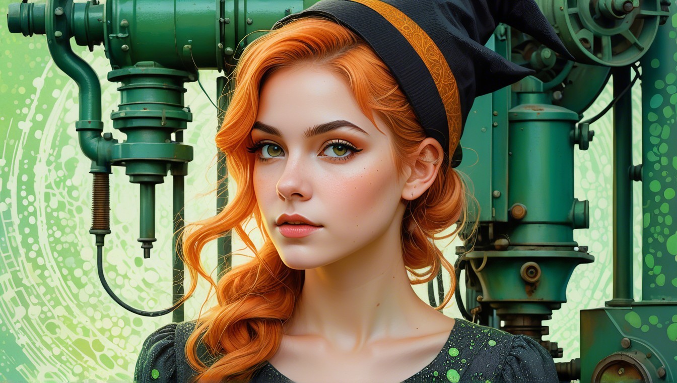 Simplistic stylization, Juvenile witch portraiture with a twist, Acid-Pixie-style headshot, industrial machinery in background. greenish accents, squiggly storybook illustration,mesmerizing acrylic pointillism painting, headshot of a woman, intricately textured, unrealistic light transitions and indentations in details, warm greenish coloring style with contouring outlines, radiance in fractured connections. Lomography Konstructor multi-exposure photography, greenish theme, triadic color scheme green beige burnt orange, chiaroscuro watercolor accents, rim lighting. Indulge in wet-on-wet effects, white, indigo, impossible light transitions, layered patterns, Indiecraft nuances, 1990s aesthetics, gradient inking vibrant colors,estranged metallic lineage and line-art fusion, blending ukiyo-e and fauvism styles, featuring a pastel color palette. The artwork should incorporate 3D effects, sharp focus, and detailed linework, with a stylization merging George Hardie, Toulouse-Lautrec, O'Keeffe, Cezanne, and Storm Thorgerson. Include liquid elements, floating motifs, dynamic lighting, and joyful, serene vibes. Integrate novelty architecture and an industrial approach, with a lineage landscape under a stormy sky. Infuse ultra-realistic tribal patterns, artistic visual flair, and water drop ink effects. The digital illustration showcases pastel hues, ethereal lighting, intricately carved features, blue eye shadow, and golden accents. Embrace fantastical acrylic art, with orange sunrise tones and an warm-toned American Gothic ambiance, Craftcore and Juminocore fusion. The artwork, a blend of Remedios Varo, Nam Yune Paik, Roberto Matta, Marcel Duchamp, Overton Loyd, Jim Davis, Ho Baron, and Ruth Henshaw Bascom. Embrace Emshwiller and Arshile Gorky hues, textured layers with subtle expressiveness,