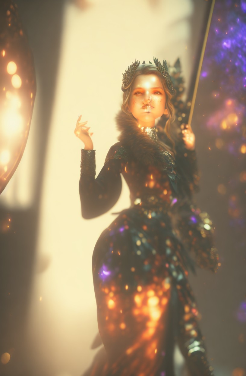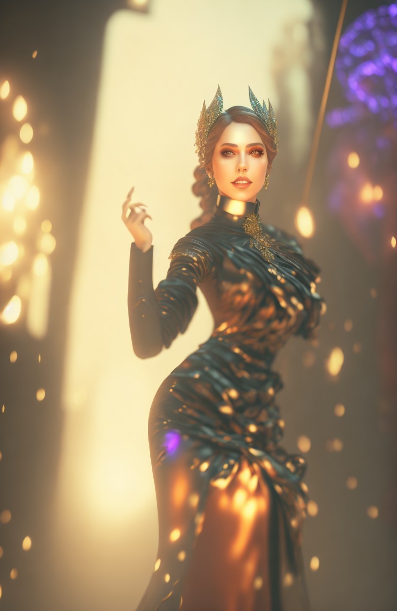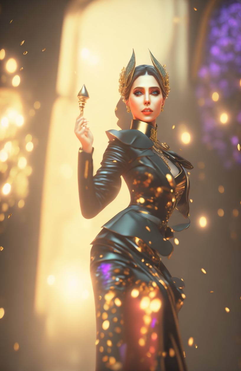 Futuristic woman in black and gold outfit against spark-filled backdrop