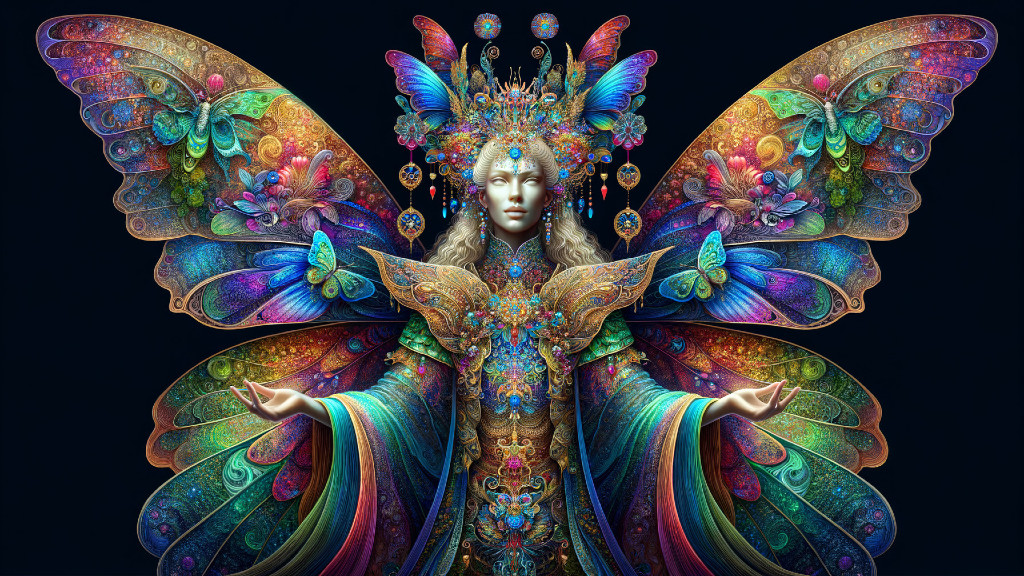 A woman with vibrant butterfly wings and a floral crown radiates an ethereal presence against a dark background.