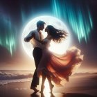 A couple embraces on a beach, radiating passion against a backdrop of shimmering northern lights and a glowing orb. Their flowing garments blend colors, enhancing the romantic atmosphere.