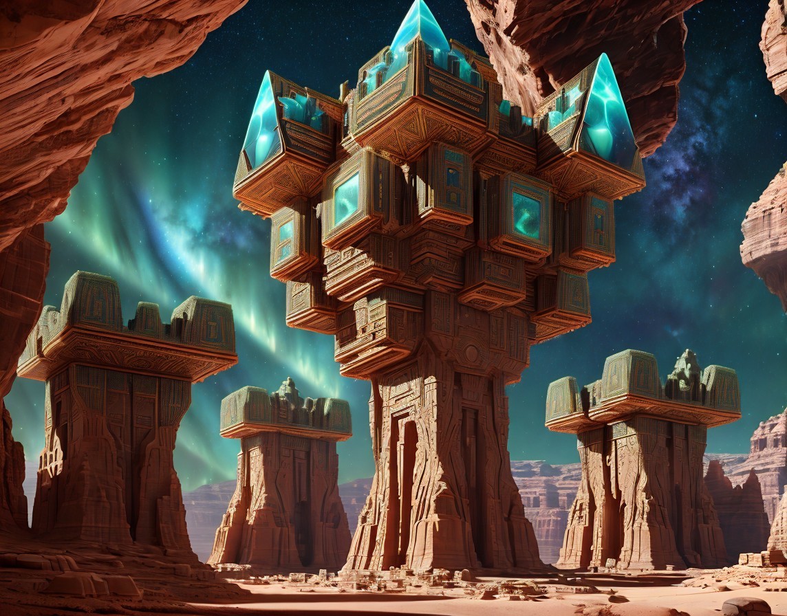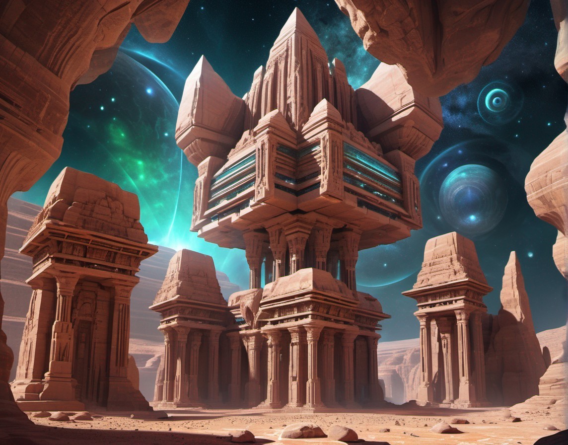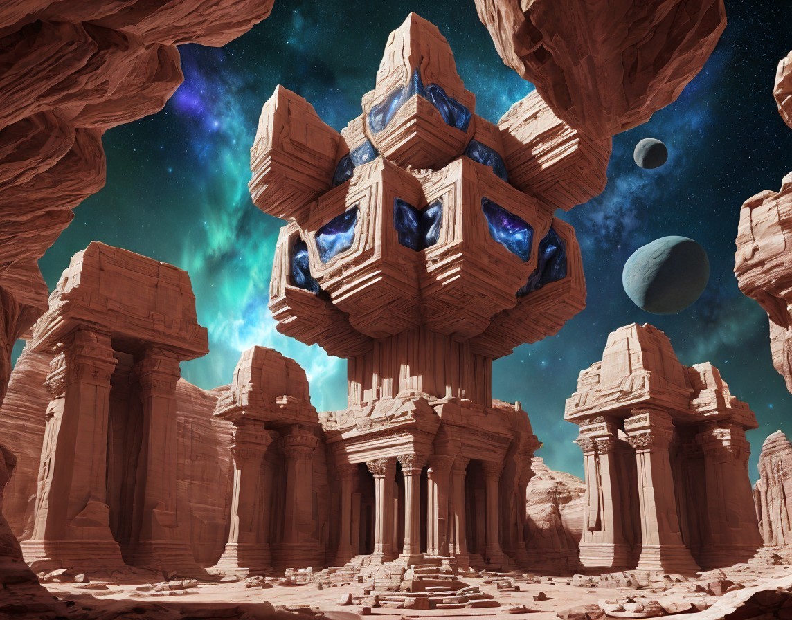 + Prompt:Surreal high-tech alien temple similar to Petra adorned with intricate geometric patterns. Petra-like temple, Extraterrestrial temple assimilated with advanced alien technology in a cosmic landscape. Planets and nebula. Sacred geometry. Dynamic landscape with massive ravines and canyons. large, jagged, phosphorescent crystals. Magical crystals. sacred geometry, mystical, Realistic and natural elements, In the style of Cameron Gray