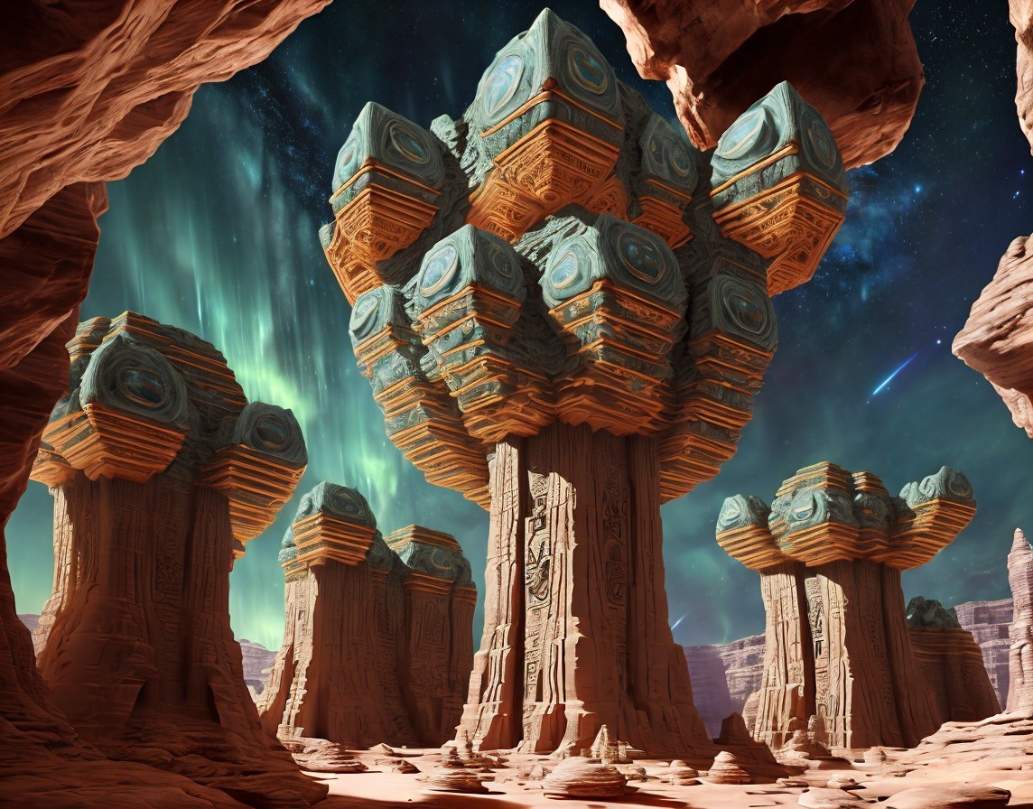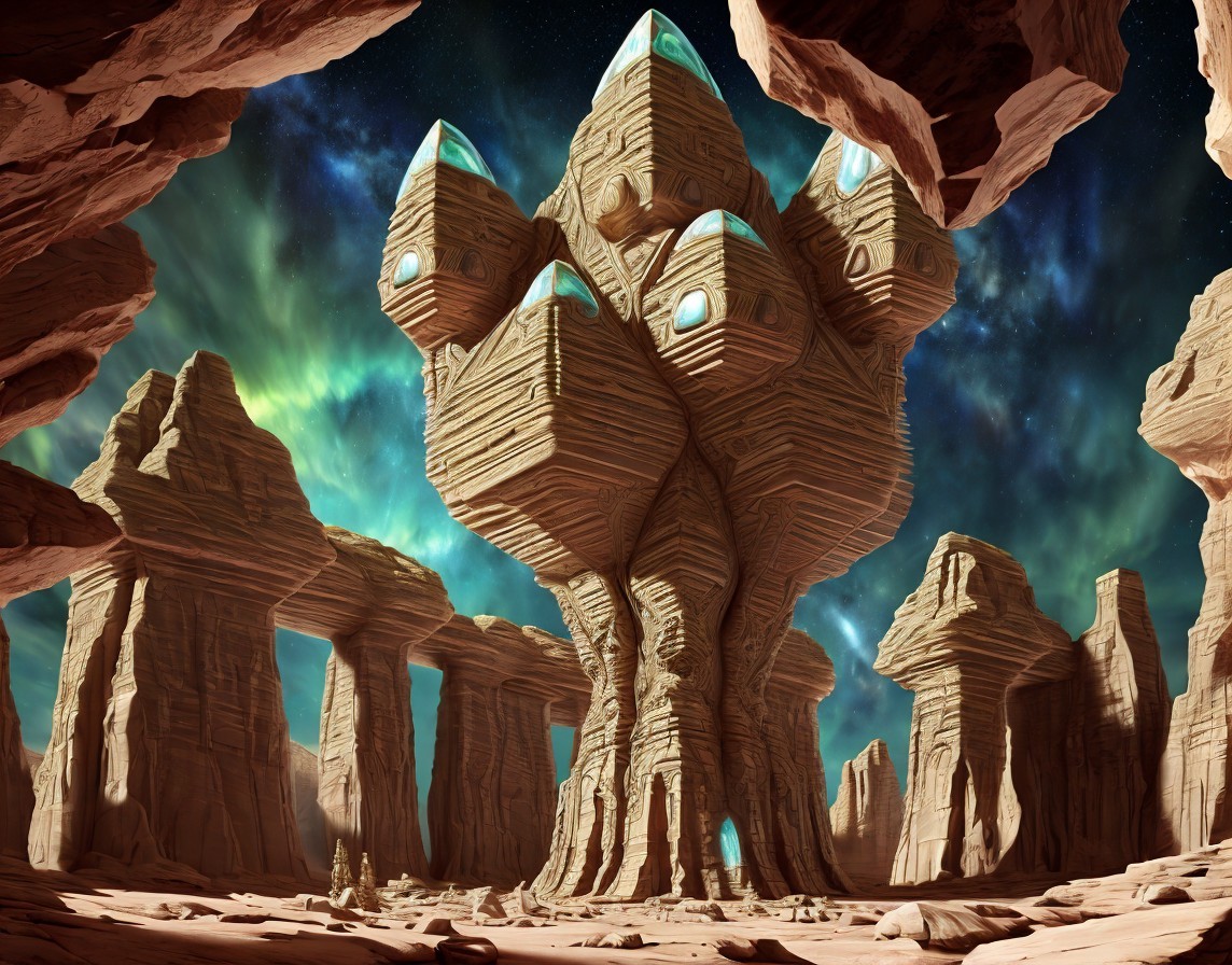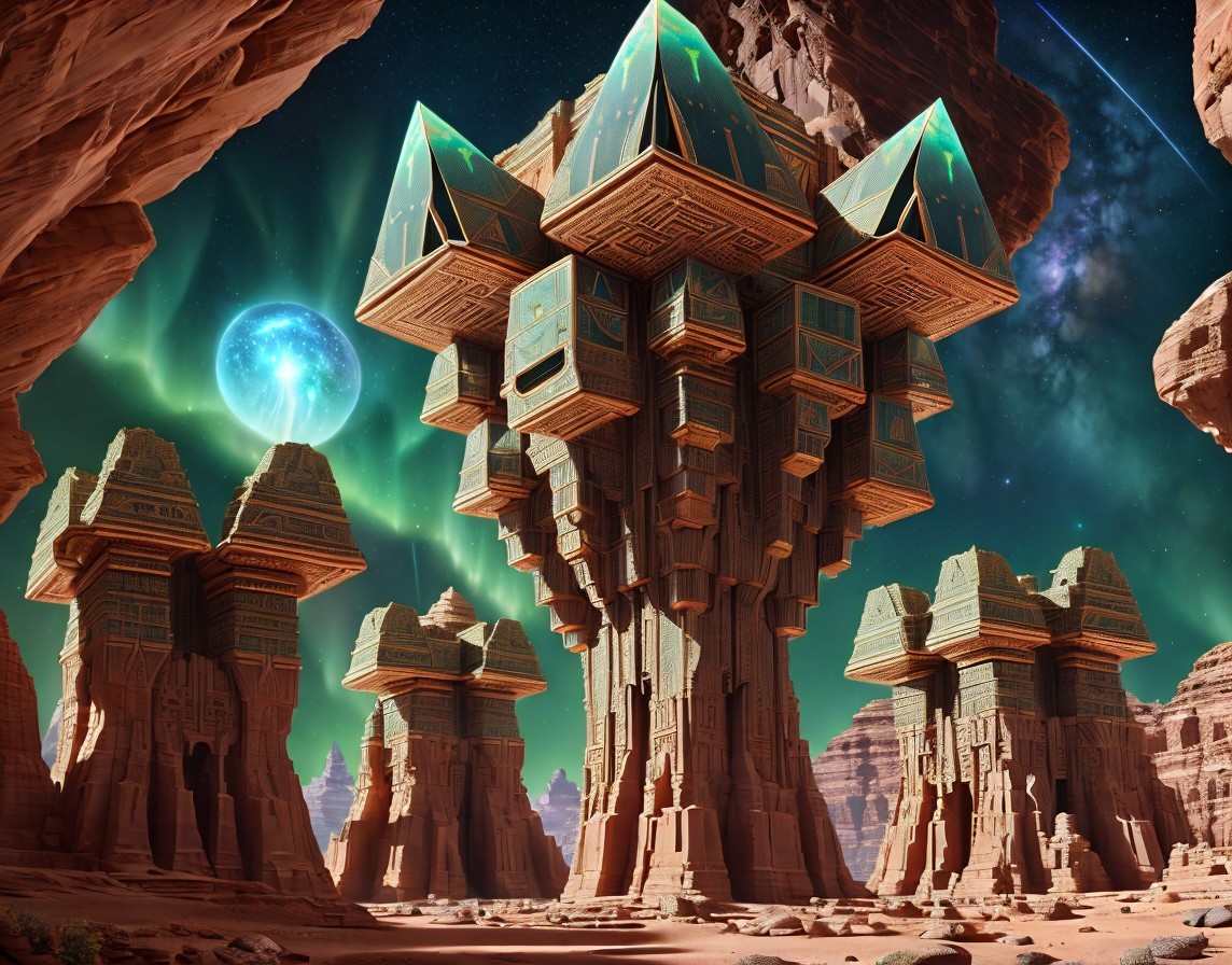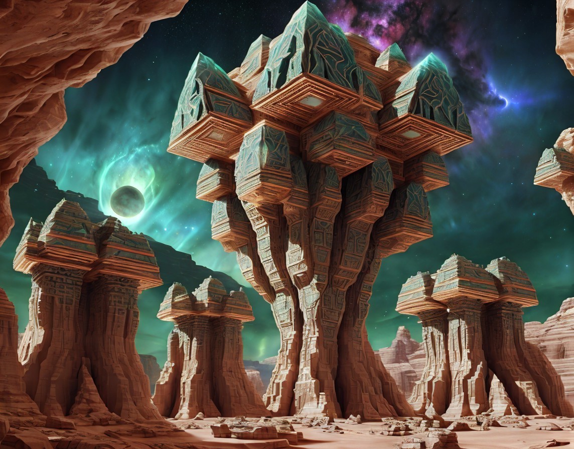 + Prompt:Surreal high-tech alien temple similar to Petra adorned with intricate geometric patterns. Petra-like temple, Extraterrestrial temple assimilated with advanced alien technology in a cosmic landscape. Planets and nebula. Sacred geometry. Dynamic landscape with massive ravines and canyons. large, jagged, phosphorescent crystals. Magical crystals. sacred geometry, mystical, Realistic and natural elements, In the style of Cameron Gray