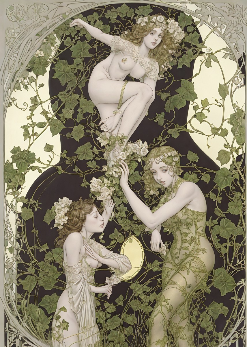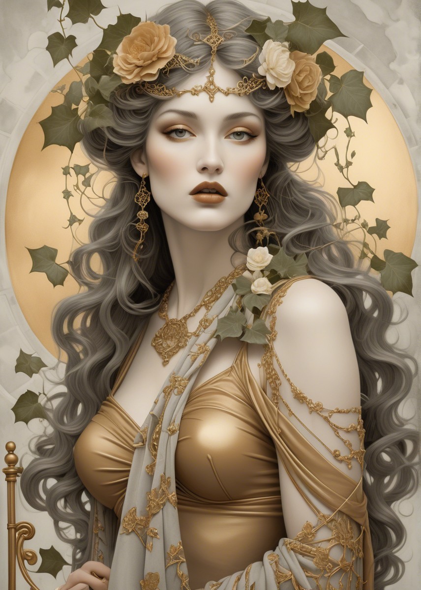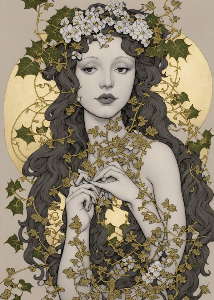 A woman in a flowing gown ascends a staircase adorned with ivy, white roses, and butterflies, exuding an ethereal ambiance.