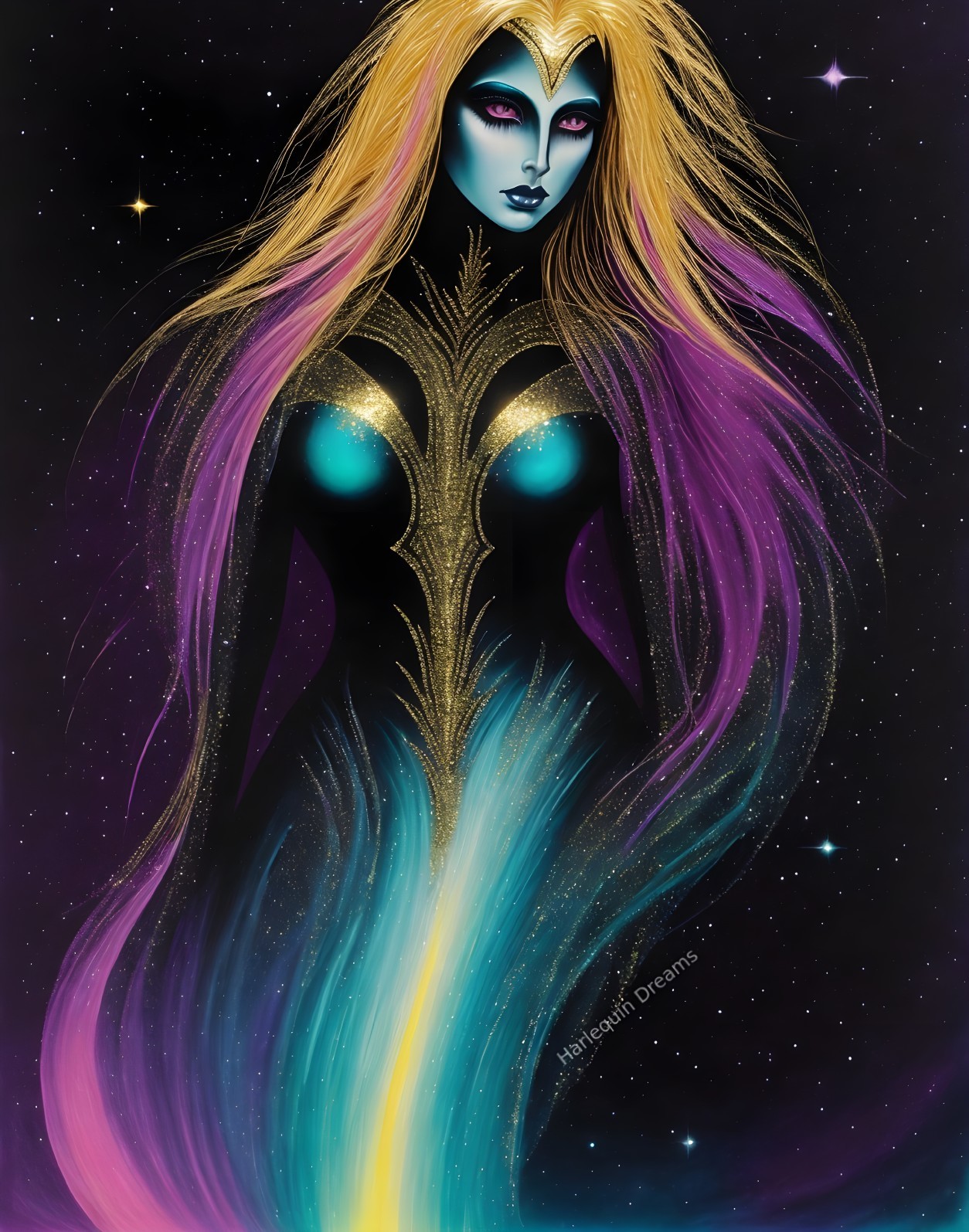 Illustration of a cosmic entity with galaxy-themed body, golden details, and flowing hair against a starry backdrop.