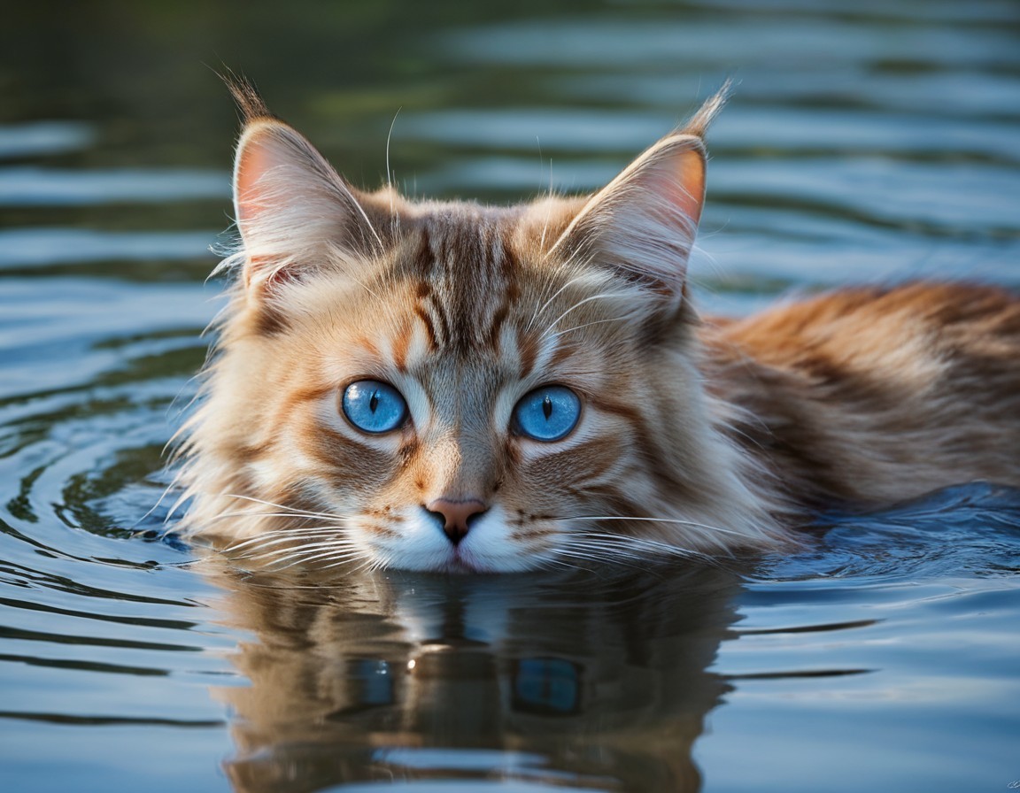A cat with striking blue eyes is floating calmly in the water, with its face just above the surface, creating ripples.