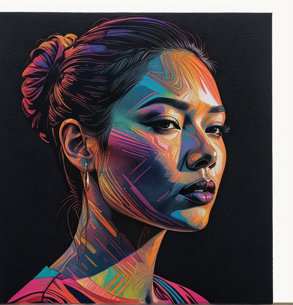 Prompt: textured watercolor and ink painting merged with linocut, female portrait, layered, stylized by Ed Binkley and Freda People, color glitch aesthetics, embodiment by Ho Baron, phong shading, lighting by Ed Binkley, divisionism, colourful surreal, complex line-art, contouring forms by Philippe Starck, dyed, nuanced painterly, abstract outlines, warped, tall and lean details, avant-garde merge with modernism, complex coloring reminiscent of Keith Haring's style, fine micro-pen line art with warped watercoloring, skin texture, hues by Margaret Keane, warped, simplified trippy op-art, brightness 1.3, translucent and opaque orphism reference, very abstract post-avantgarde style, triadic color scheme starfleet-blue magenta-red dark-grey, soft pastel colors, squiggly orphism and geometrical art merged with jsgraffito. outlines reminiscent of Francis Bacon and Georgia O'Keeffe and Jim Davis, lines by William Bradley, sawtooth wave, negative lucas numbers, Psychosomatic surrealism by Gayane Khachaturian and Paul Kidby, linework and tinsels dissolving into textures, cross-hatching, collided fierceful, brushed, soft energy, rupture and decay, fragile coloring and outlilnes. Deconstructed. fine-line drawing with airbrush techniques, intricate line-art with diffused highlights and reflections, mip-mapping, texture mapping 1.3, dappled and rimmed shimmer, low key lighting, low light, contrasting textures, tangled gemometrical features, translucent and obscuring, hazy and indistinct, misty, blend of warm bluish and warm greys by William Bradley, shadow mapping 1.3, colorful gradients, texture mapping enhancing depth and scale,