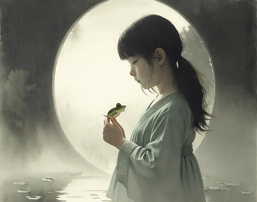 Prompt: A painting of a child in profile watching a frog in a pond; a soft filmy ink and watercolor inspired by Mori Sosen and Odilon Redon, with beautiful soft features by Gyokudō Kawai and Sarah Moon. Simple, elegant composition, delicate details, tertiary color palette, mist, serenity