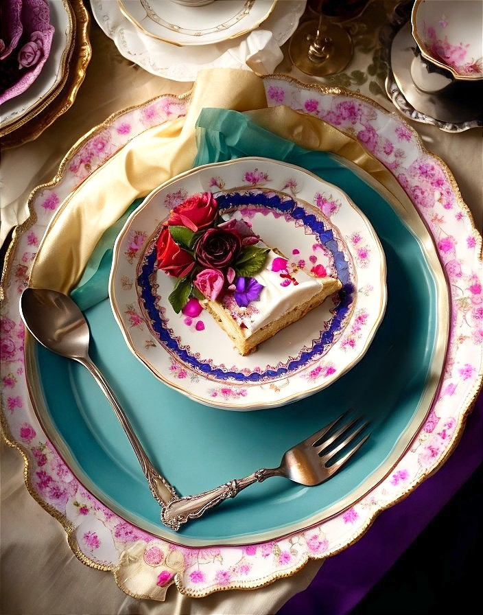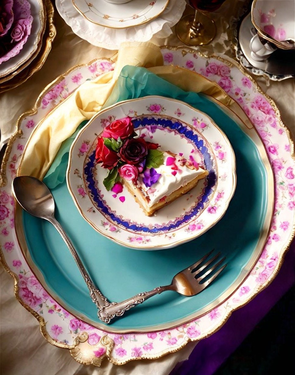 Prompt: "alice in Wonderland; Dead still teaparty scene by marta petrucci photogrpher; fragile, fashion; Dead still breakfast aims to immortalize the characters of my favorite books in the act of eating, the food described in the book, by contextualizing it as a 'crime scene' viewed from above. Like a still life, it contains all the elements that describe the book in question, everything is immobile in time, but in a single moment I want to tell the whole story. In particular, the moments in the story when the characters are having breakfast or eating dessert with a drink are chosen. My ultimate intention is to entice those viewing these photos to perhaps re-read the book described and bring to life recipes inspired by those described."