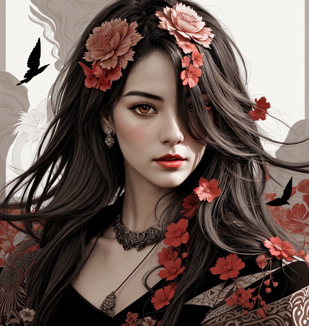 Woodblock print 1.7, close-up portraiture, beautiful female face, stylized illustration 1.9, triadic color scheme grey red beige, grain, 3d effects, brightness 1.9, ambient occlusion 1.5 saturated colors 1.8, soft edges, crisp lines, fantasy art, HDR, lineage details, vibrant occult mood, glossy highlighted strokes on old paper, radiance, hues, devilish eyes 1.7, ghostly appearance, dark rim lighting 1.7, 3d effects, raytraced shadows, anisotropic filtering 1.9, Abstract, complementary textures, granular surface structure, stylized lineage illustration, overlays, mezzotinto, dry brushing, scumbling, ,wavery lineage stenciling, raytraced shadows, high coloring, contrast colors, facial expression by Edward Hopper, daguerreotype photography style, smooth crackles, volumetric lighting 1.7, anisotropic filtering 1.7, dynamic lighting 1.7, raytraced shadows 1.8, chiaroscuro lighting in background, psychedelic psychpomp scene, candyfloss flares, radiance, maximalism, layered geometrical vector art, octane render illustration 1.5
