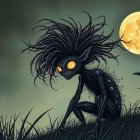 A whimsical creature with wild hair and glowing orange eyes sits in tall grass under a full moon. The night is dark, and two birds fly in the background, adding to the mystical atmosphere.