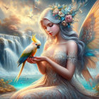 A serene scene depicting a woman in a flowing gown surrounded by vibrant flowers, holding a colorful parrot. Two majestic birds perch nearby, set against a backdrop of cascading waterfalls and a glowing sky.
