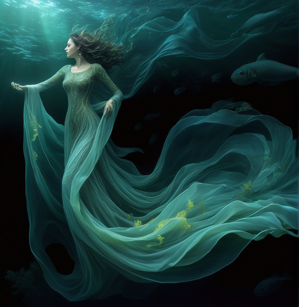 + Prompt:Underwater witch casting a spell through biomorphic wave patterns, delicate flowing pale clothes in harmonious colours, anatomically proportionate and accurate, bioluminescent green and yellow seaweed moving with the ebb and flow