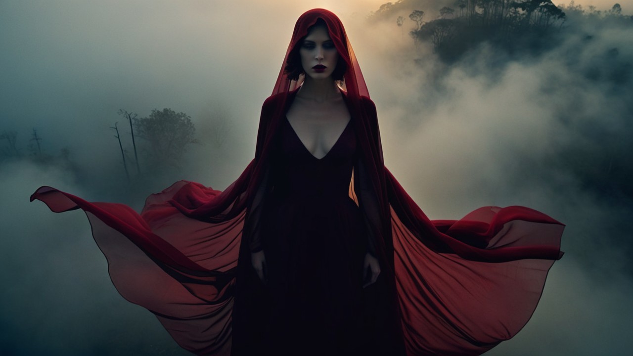 A mysterious figure in a flowing red gown and hood stands against a foggy cityscape. Her striking presence blends elegance with an air of enigma, captivating the viewer's attention.