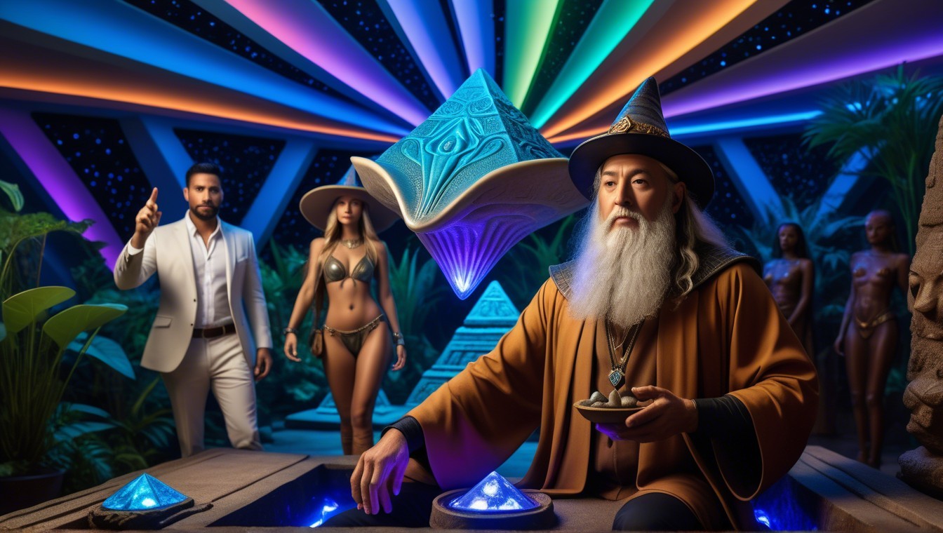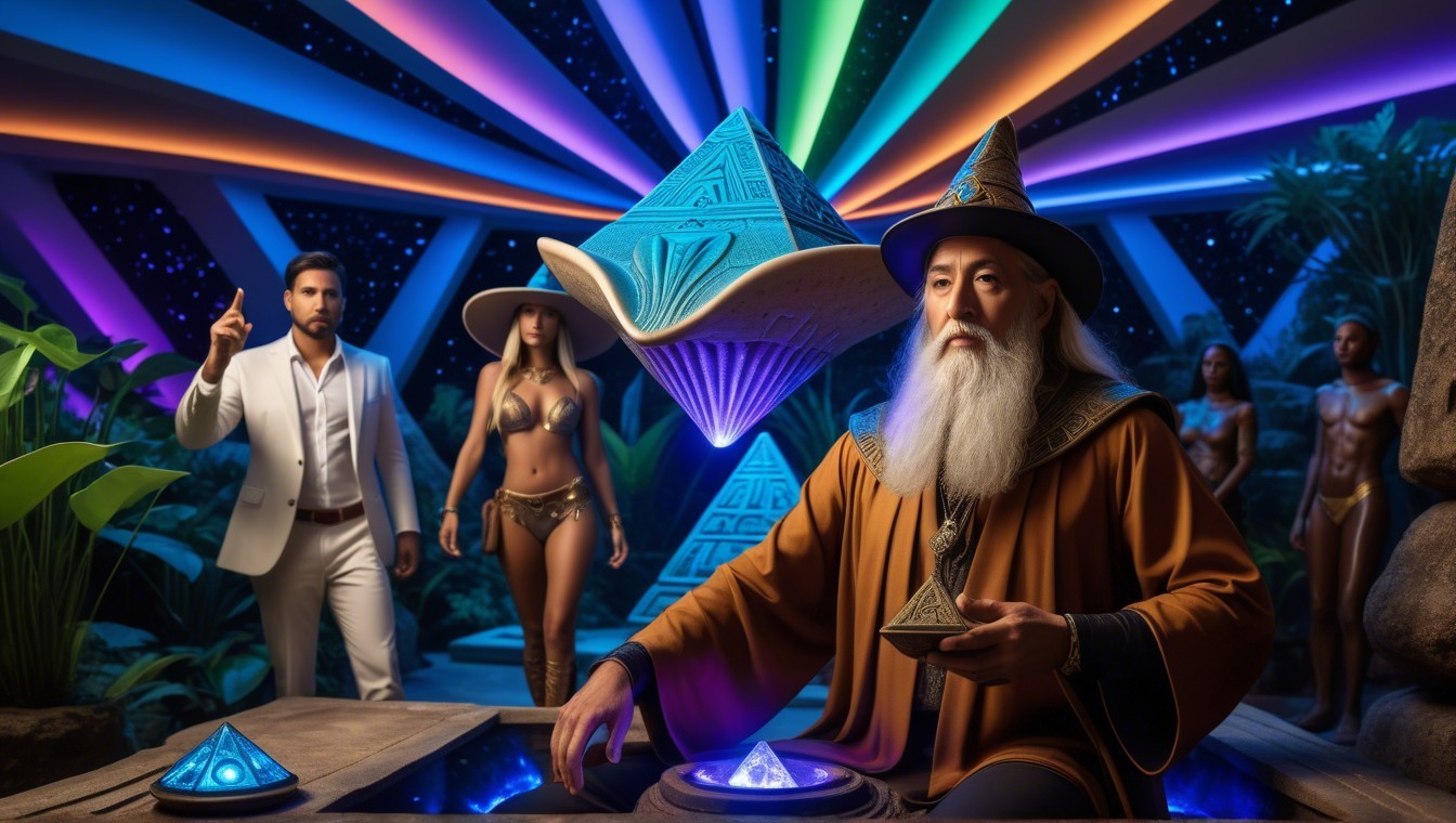 A wise wizard with a long beard and pointed hat stands amidst glowing pyramids and mystical artifacts in a lush, illuminated jungle, casting an air of magic and ancient knowledge.