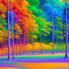 A vibrant landscape featuring tall trees with colorful autumn foliage. The ground is blanketed in purple flowers, under a bright blue sky, creating a cheerful and serene atmosphere.