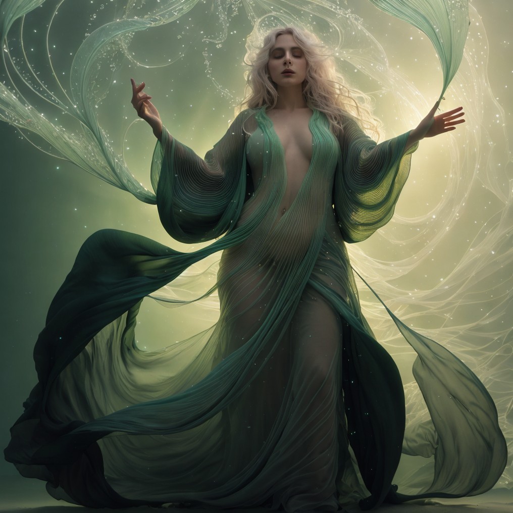 + Prompt:Underwater witch casting a spell through biomorphic wave patterns, delicate flowing pale clothes in harmonious colours, anatomically proportionate and accurate, bioluminescent green and yellow seaweed moving with the ebb and flow