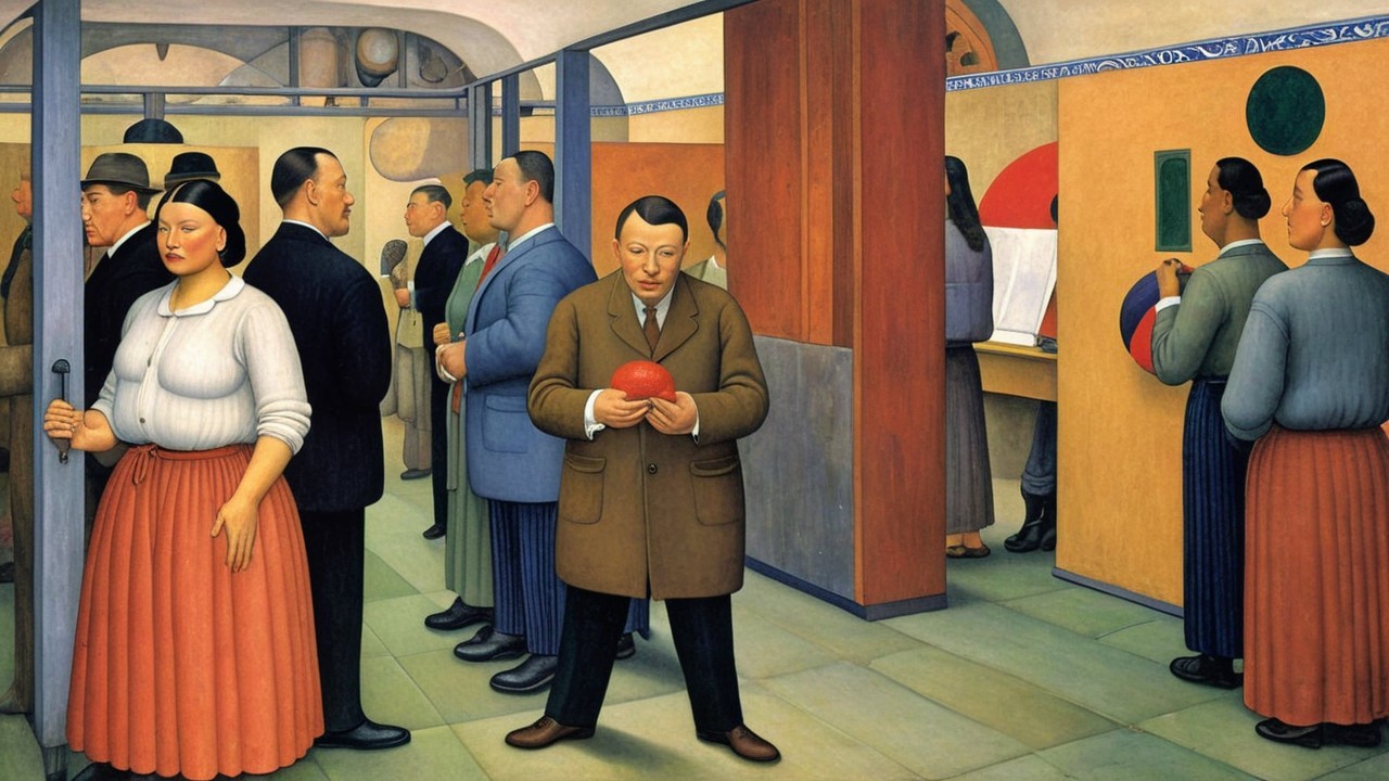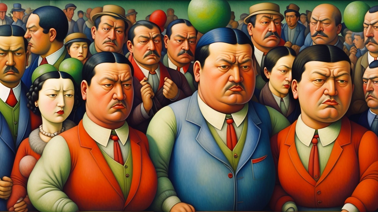 A group of men and one woman stands solemnly, dressed in vintage clothing with a mix of vests and hats, conveying a sense of unity and seriousness in a historical setting.