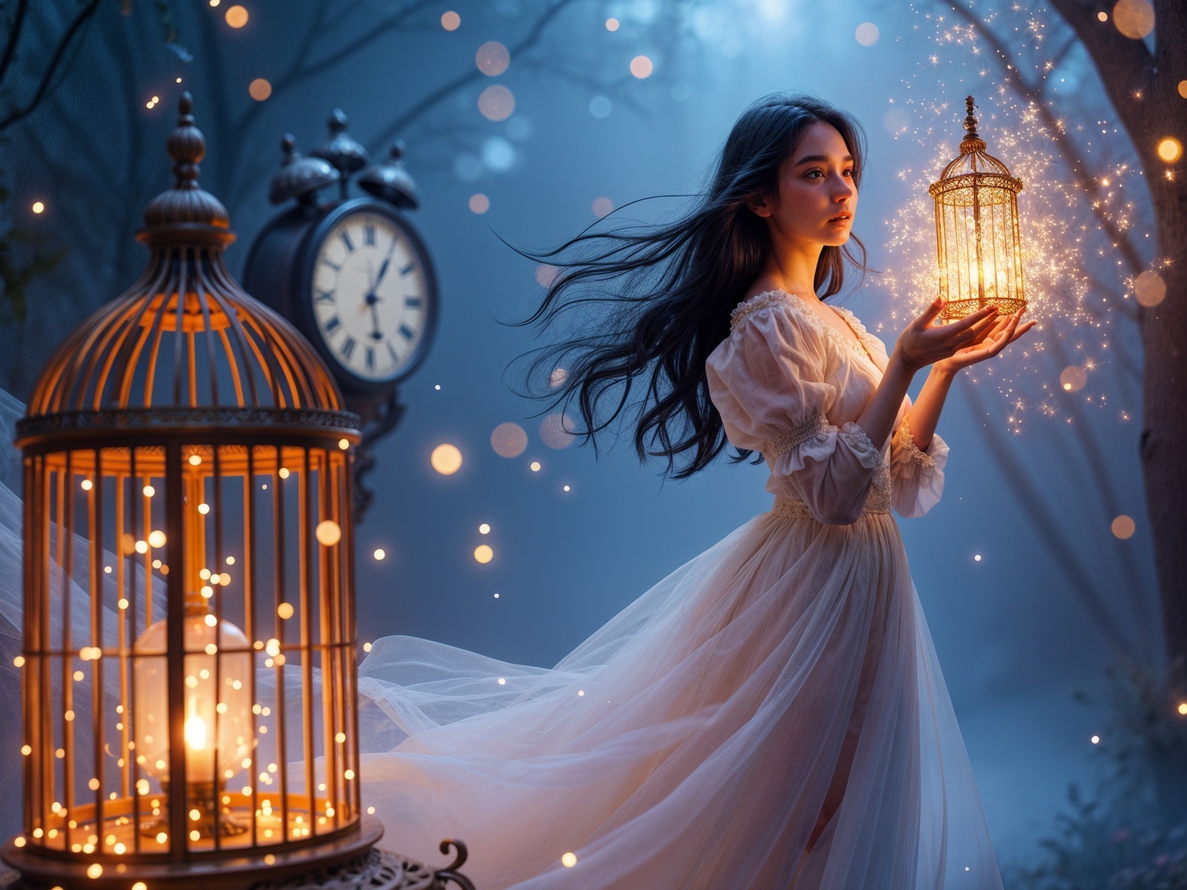 To the left, a large, intricately designed ornate cage emits a soft, golden glow and is filled with shimmering lights that seem to dance and twirl, creating an atmosphere of wonder and magic. The background features a mystical blue and purple gradient with floating, luminous orbs and a large clock hanging in the air, suggesting the passage of time amidst this otherworldly setting.