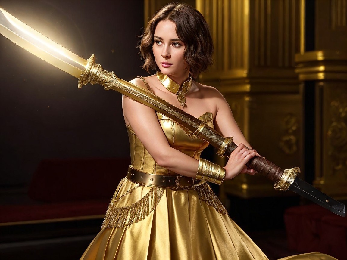 A regal figure stands confidently, adorned in an elegant gold outfit with intricate details. She holds a gleaming sword, radiating strength and determination against a rich, opulent backdrop.