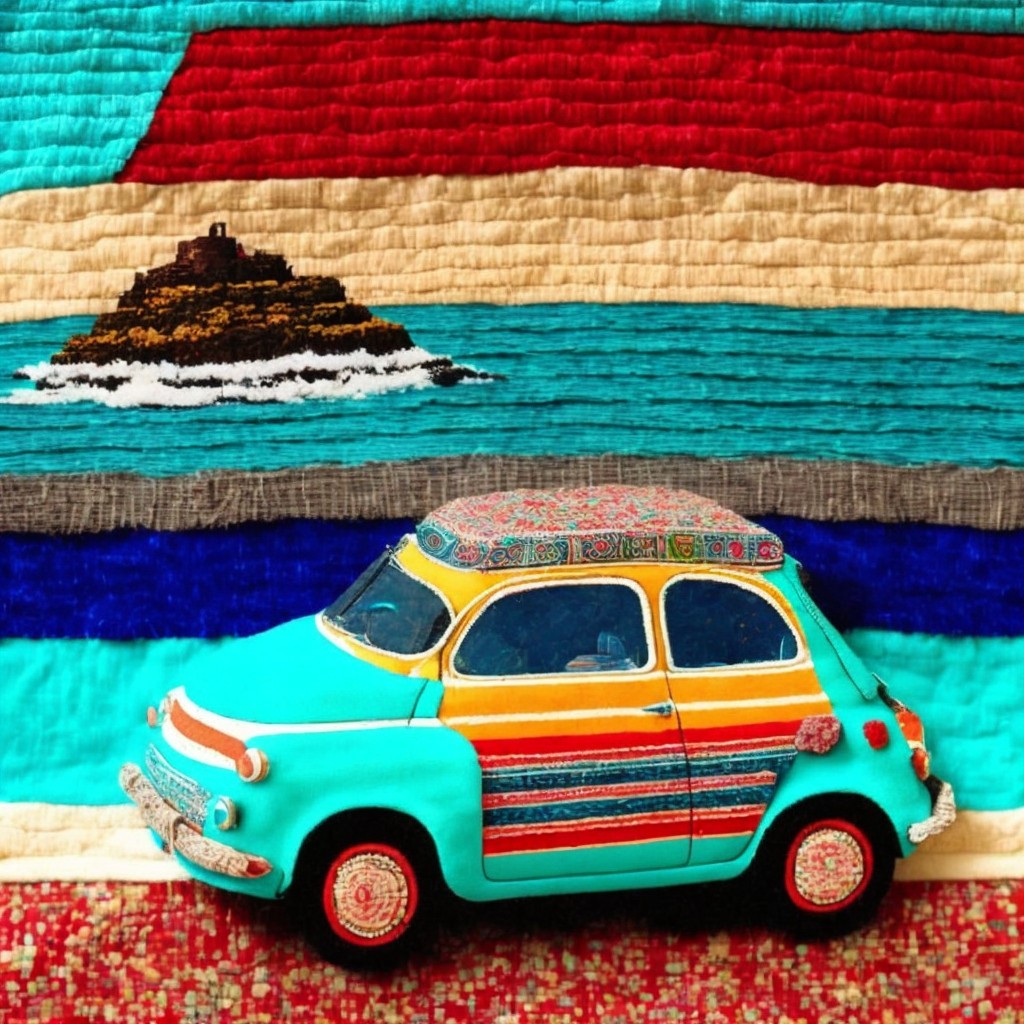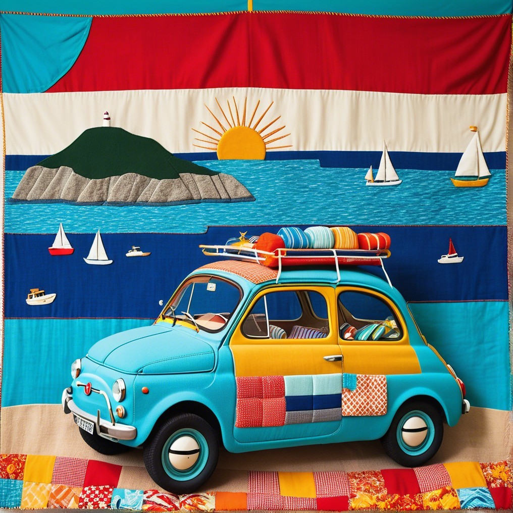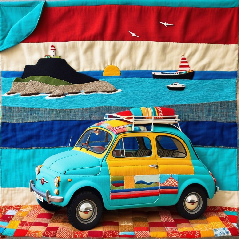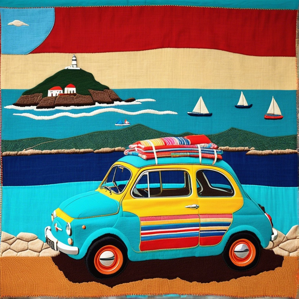 This piece captures the whimsical essence of a nostalgic Mediterranean vacation through the lens of tactile, textile-inspired storytelling. Rendered with visual cues of quilting, patchwork, and fabric appliqué, the image centers on a stylized vintage Fiat 500 journeying along an idyllic coastal backdrop. Its candy-colored body and luggage echo the joyous, innocent thrill of carefree summer travel. The sun rises like a stitched emblem of optimism, while sailboats glide through flat, fabric-like waters. The lighthouse-topped island reinforces the dreamlike, folk-art charm—balancing precision and fantasy in perfect harmony.