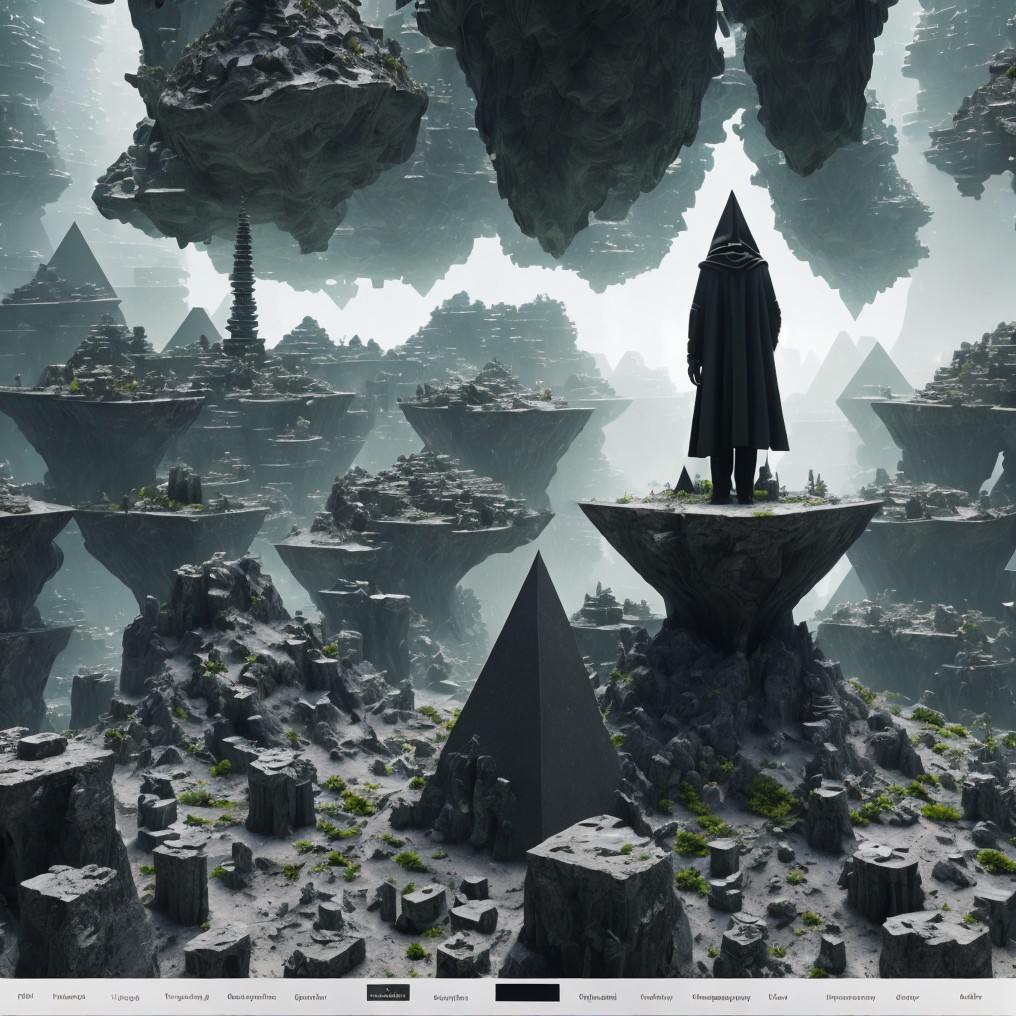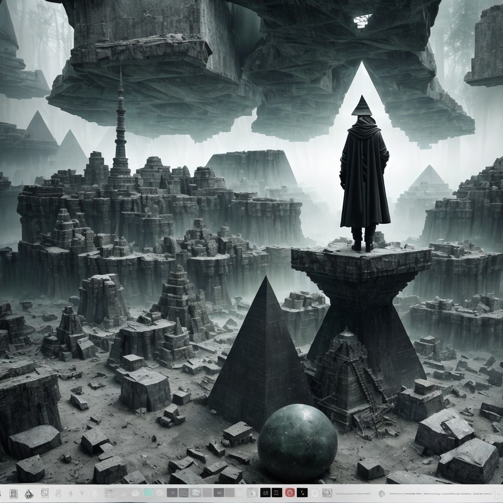 Prompt: "Create a surreal and complex scene with a multitude of interconnected elements. The dominant color palette is dark and moody with shades of black, grey, and dark greens, emphasizing a dystopian or esoteric aesthetic. At the center, place a tall, shadowy figure wearing a long black coat, standing confidently atop a pyramidal structure, gazing into the distance. Make the figure's face indistinguishable, shrouded in darkness, invoking a sense of mystery and anonymity.