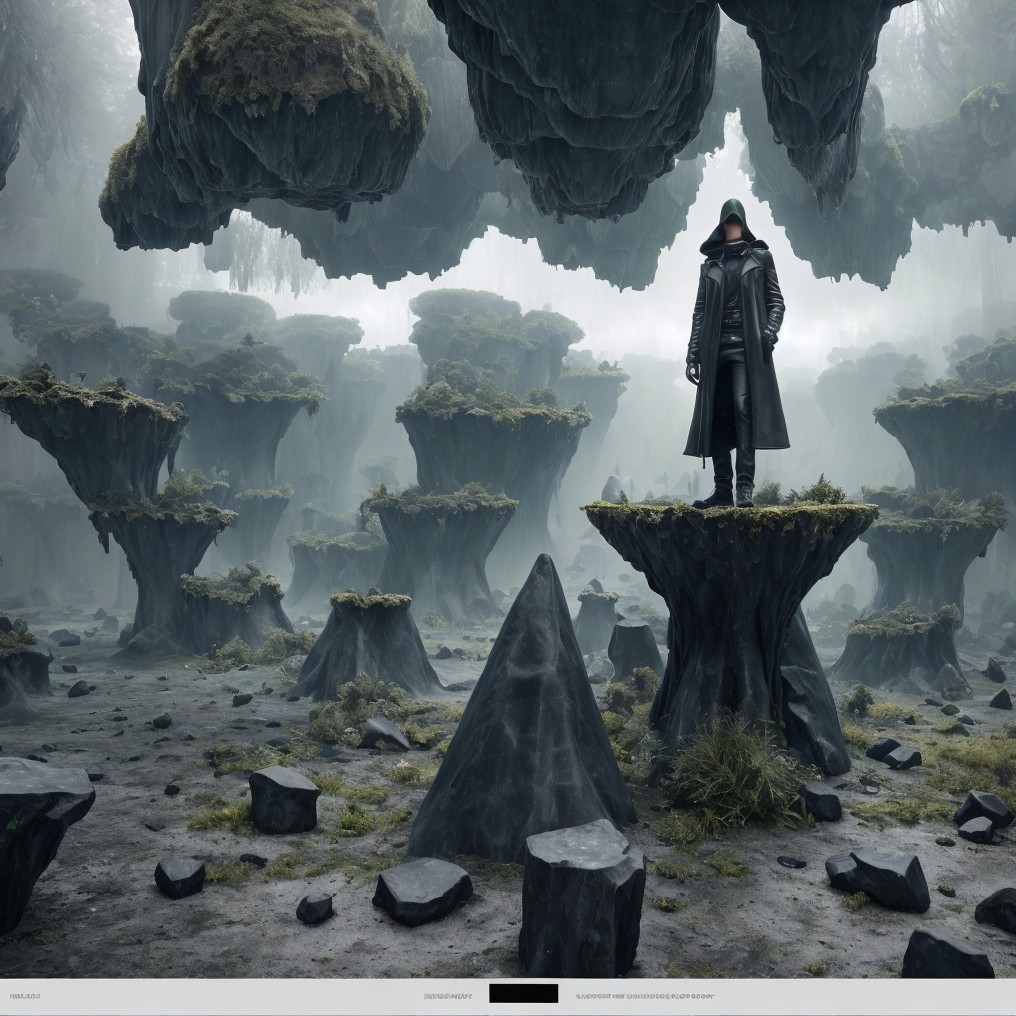 linear + exponential - oxygen from our lungs Photogrammetry Create a surreal and complex scene with a multitude of interconnected elements. The dominant color palette is dark and moody with shades of black, grey, and dark greens, emphasizing a dystopian or esoteric aesthetic. At the center, place a tall, shadowy figure wearing a long black coat, standing confidently atop a pyramidal structure, gazing into the distance. Make the figure's face indistinguishable, shrouded in darkness, invoking a sense of mystery and anonymity.