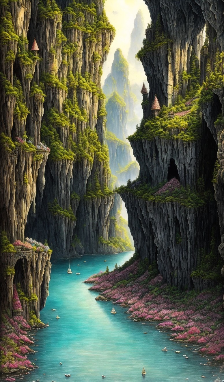 Scenic river in dramatic canyon with steep cliffs and pink trees