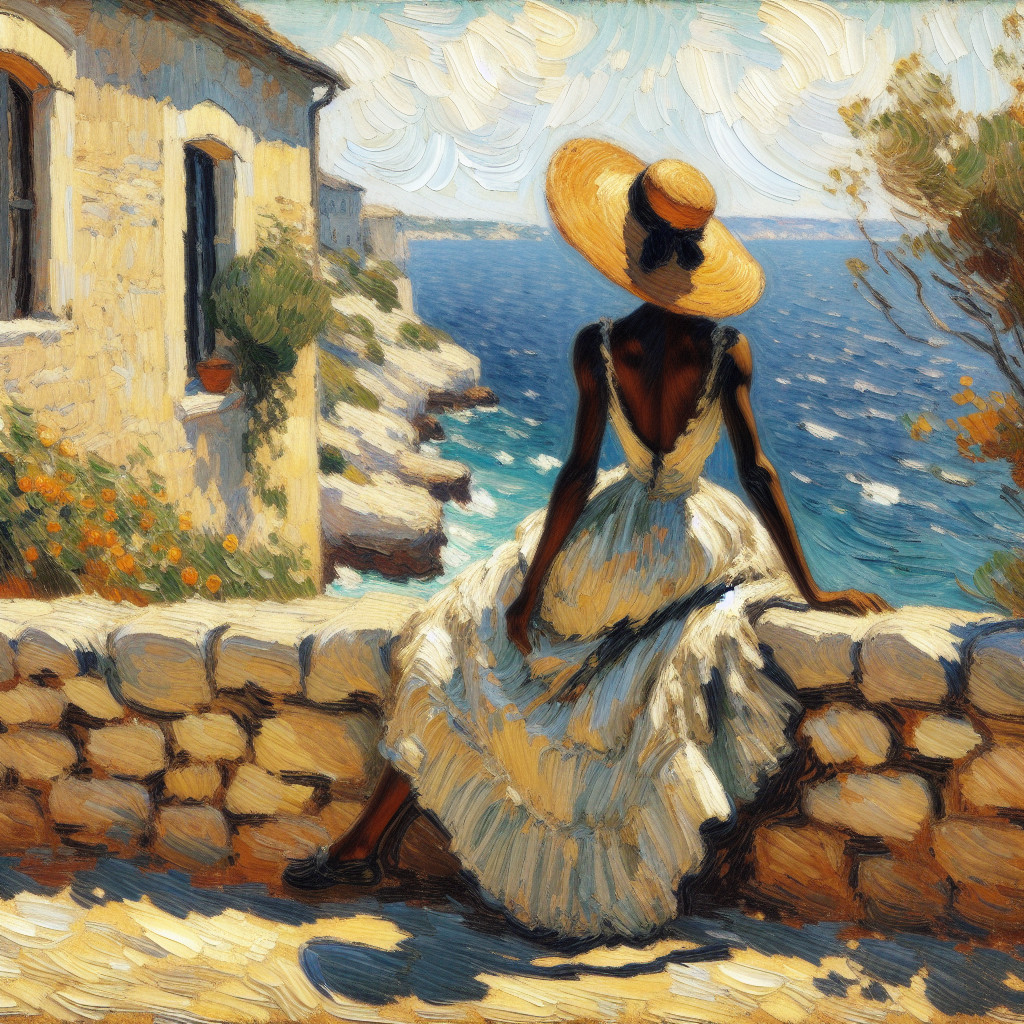 A woman in a white dress and wide-brimmed straw hat sits on a stone wall, gazing at a serene coastline under a blue sky, surrounded by vibrant flowers and a tranquil sea.
