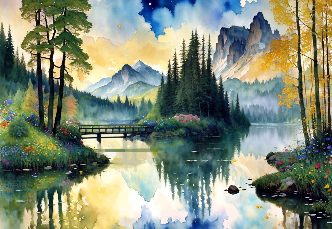 Prompt: Triangular reality. Landscape. Watercolor painting . Fanastic style of Thomas Wells Schaller and Egon Schiele. Glorious lake in the woods. Flowery. WOoden bridge. Some metal paint details by Gustav Klimt.