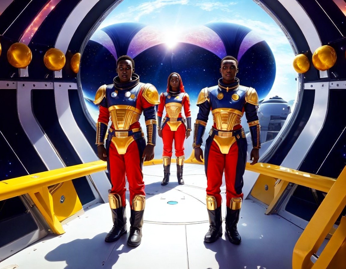 Three astronauts in red and gold suits stand in a spaceship with a view of Earth from space in the background.
