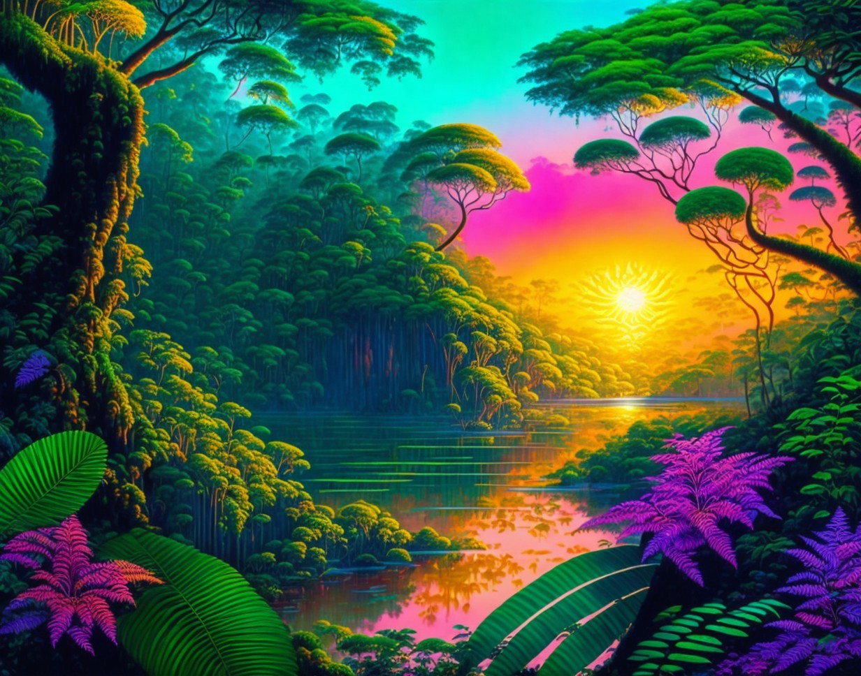 wide view, full page, 3D watercolor patchwork, spectacular sunset, Rainforest jungle, contour lighting, winding river, delicate plants and trees, teal leaves, lacy ferns, brightly colored tropical flowers, intricate, satiny, high quality, shimmering, vibrant colors, with subtle Tingatinga style elements, by William Turner, with elements in the style of Gustav Klimt
