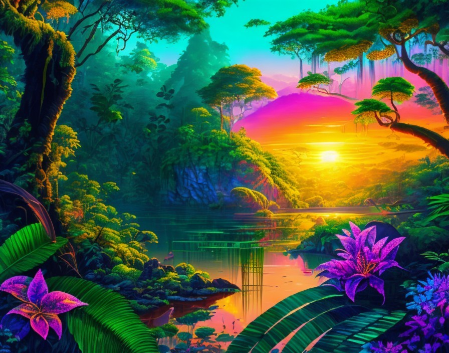 Prompt: "wide view, full page, 3D patchwork, spectacular sunset, Rainforest jungle, contour lighting, winding river, delicate plants and trees, teal leaves, brightly colored tropical flowers, intricate, satiny, high quality, shimmering, vibrant colors, with subtle Tingatinga style elements, by William Turner, with elements in the style of Gustav Klimt"