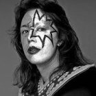 A striking portrait of a woman with dramatic face paint featuring bold black stars and geometric patterns. She has long, flowing black hair and a glamorous, sequined jacket.