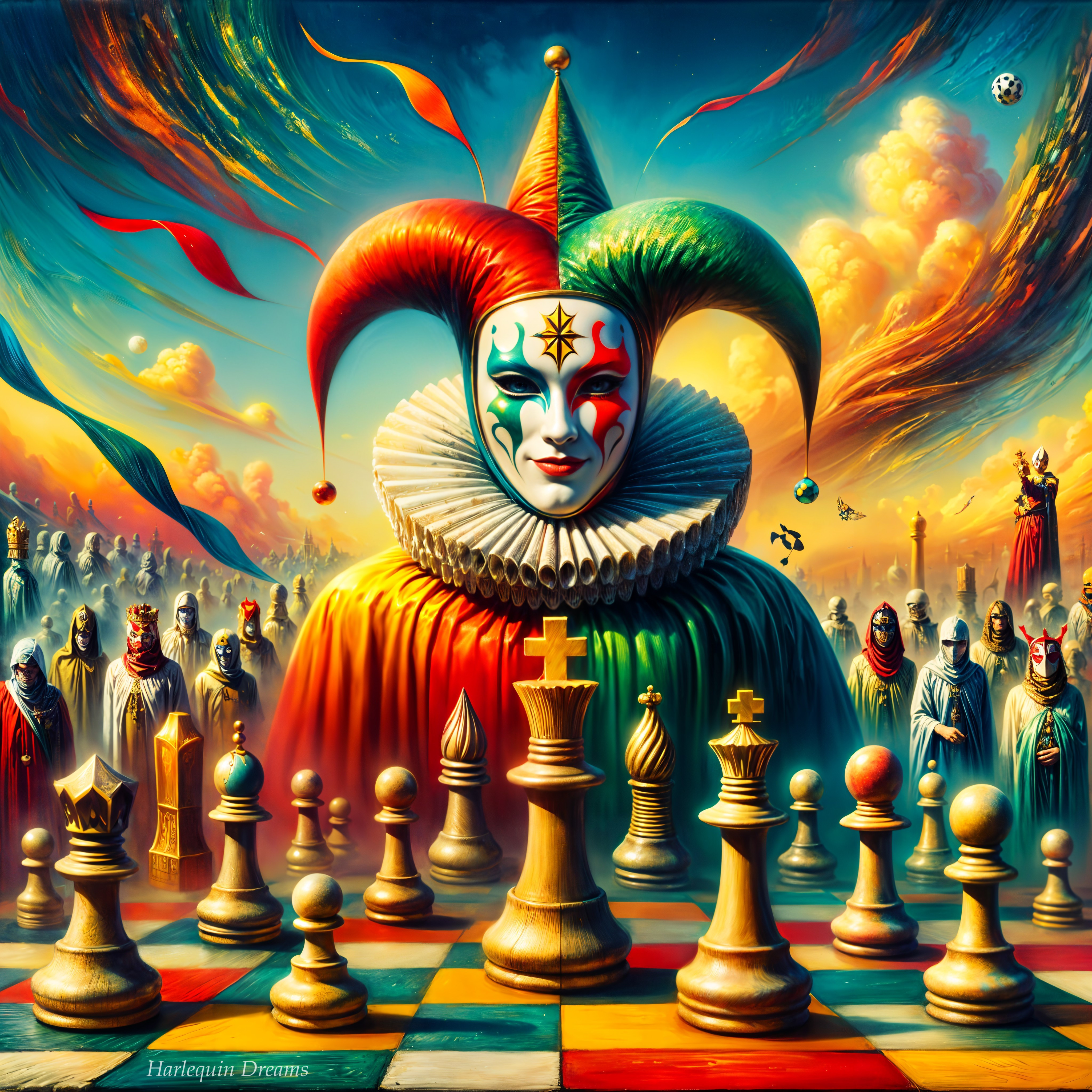 A vivid artwork of a harlequin facing a chessboard with chess pieces and detailed, fantastical sky and characters in the background.