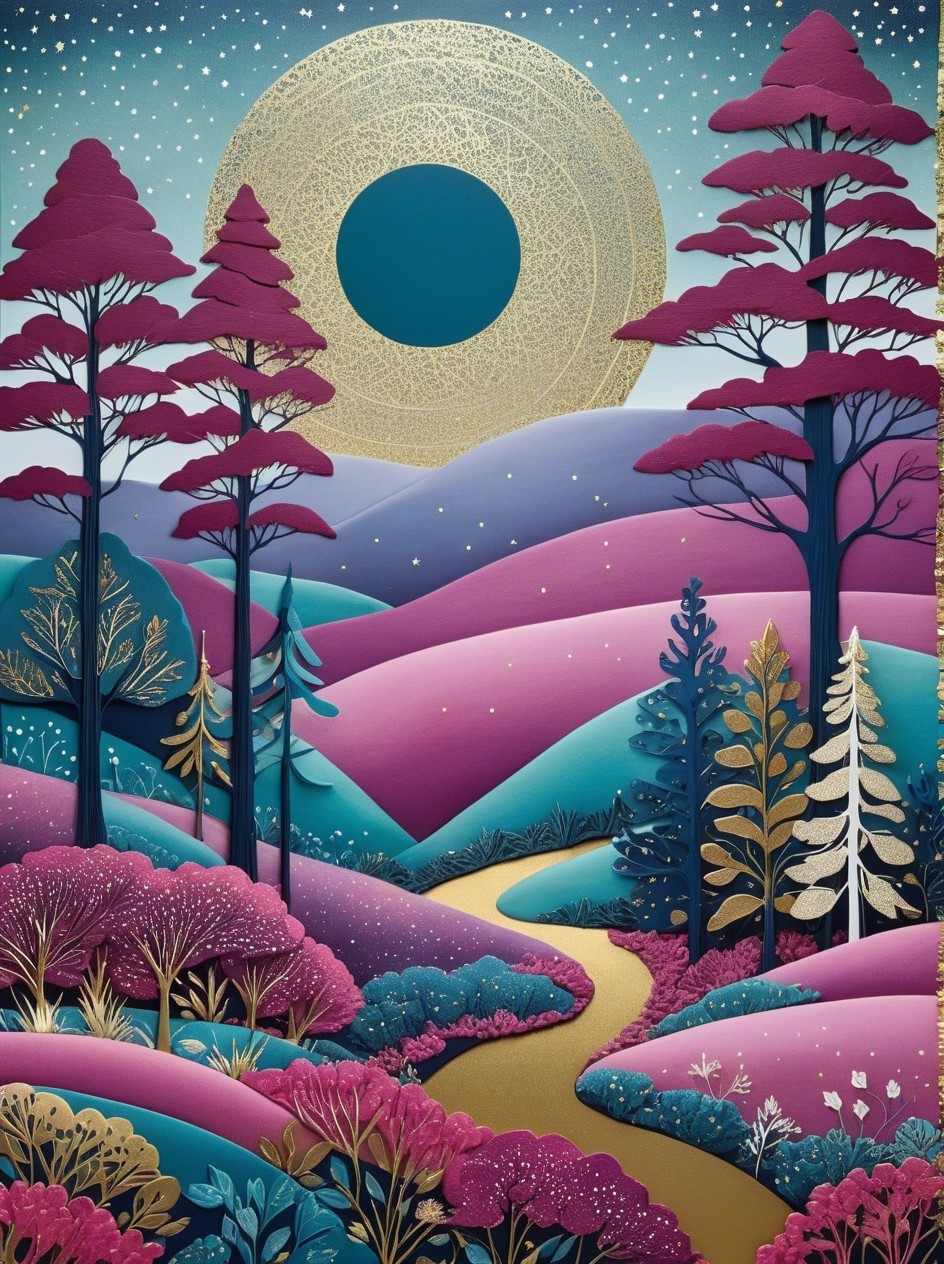 A vibrant, layered landscape featuring rolling hills in shades of purple and blue, framed by stylized trees and a shimmering golden path, all under a glowing moon and starry sky.